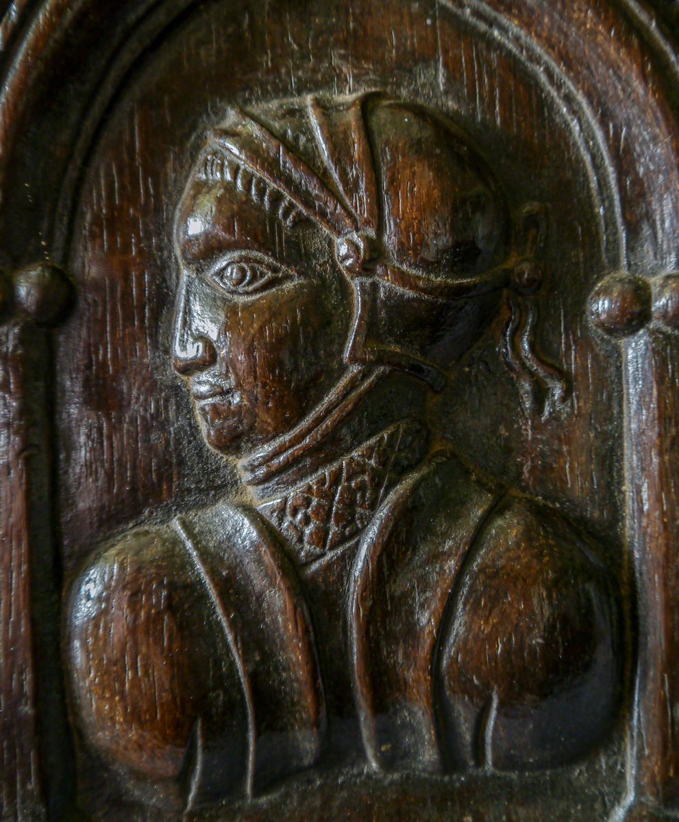 Carved with a half-portrait of a noble lady, her hair gathered within a fretted cap, or bonnet, tied at the back with ribbon in a bow. The subject has well-defined features and an elegant neck within a tall ruff collar. Her blouse has the exaggerated “padded” shoulders, the height of fashion within mid-16th century society.