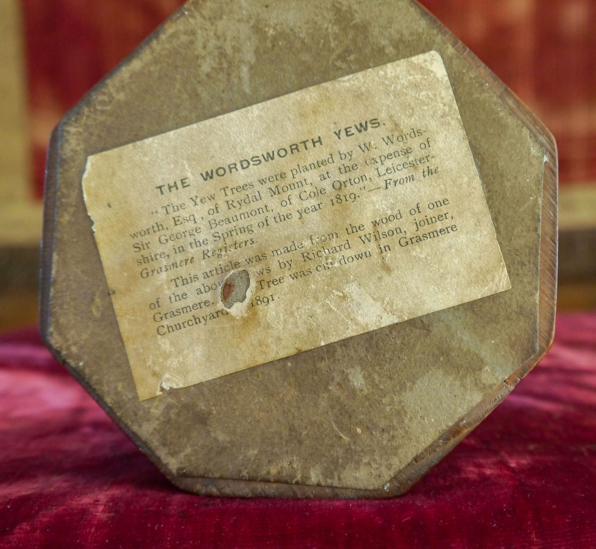A label to the underside reads "The yew trees were planted by W Wordsworth Esq, of Rydal Mount, at the expense of Sir George Beaumont of Coleorton, Leicestershire in the spring of the year 1819 - from the Grasmere Registers. This article was made from the wood of one of the above yews, by Richard Wilson, joiner, Grasmere. The tree was cut down in Grasmere churchyard in 1891. "