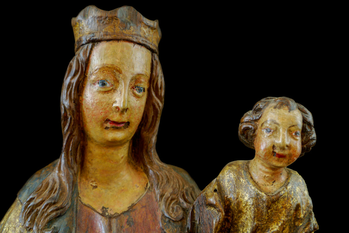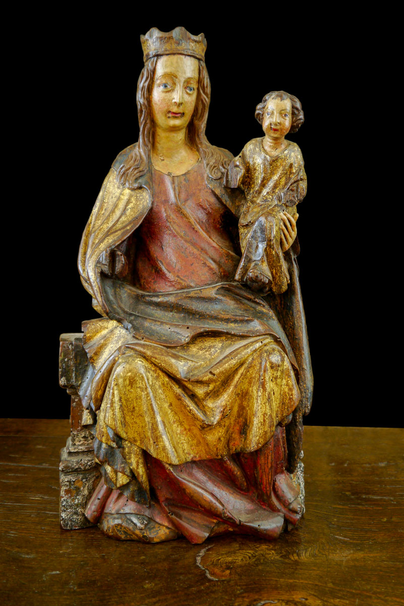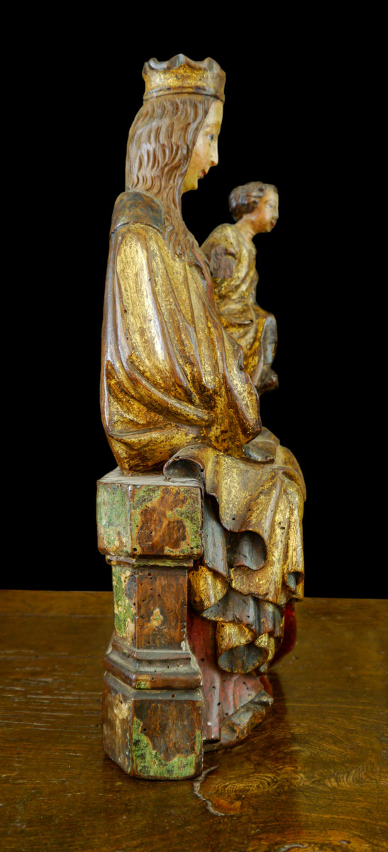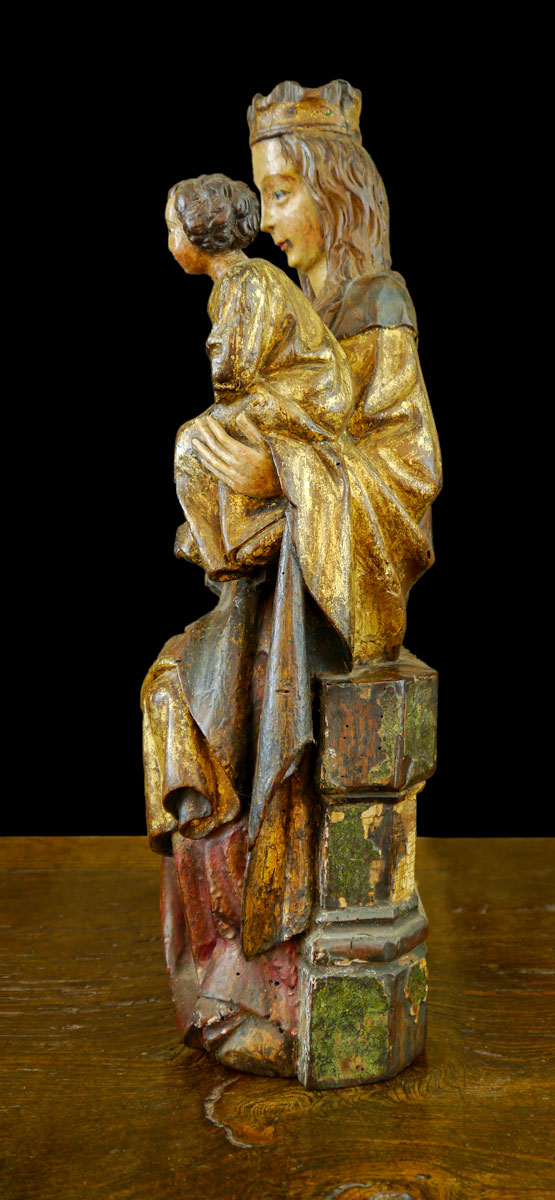 The crowned Madonna, seated and wearing a generously folded full cloak, which falls to the ground. The Christ child sits in the bend of her left arm, supported by her hand.