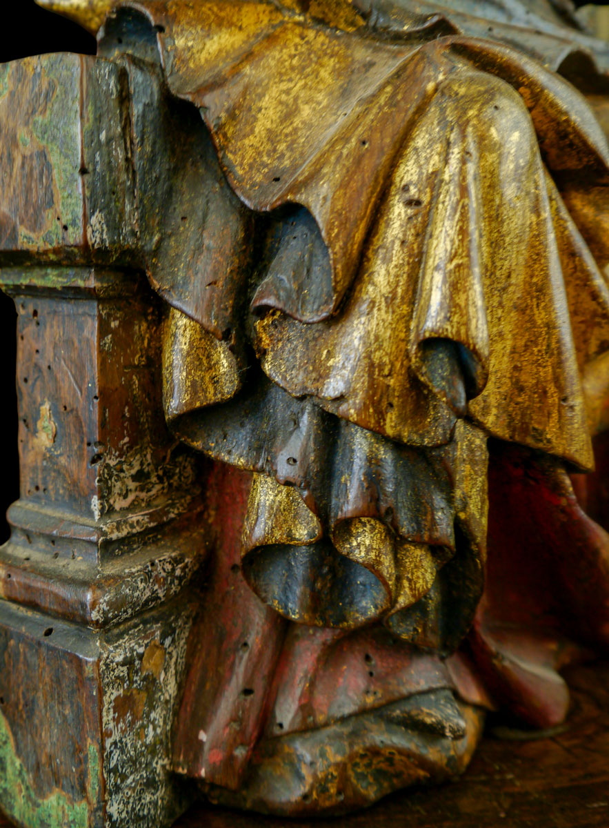 The group is carved "in the round" and retains much of the original polychrome and gilded decoration.