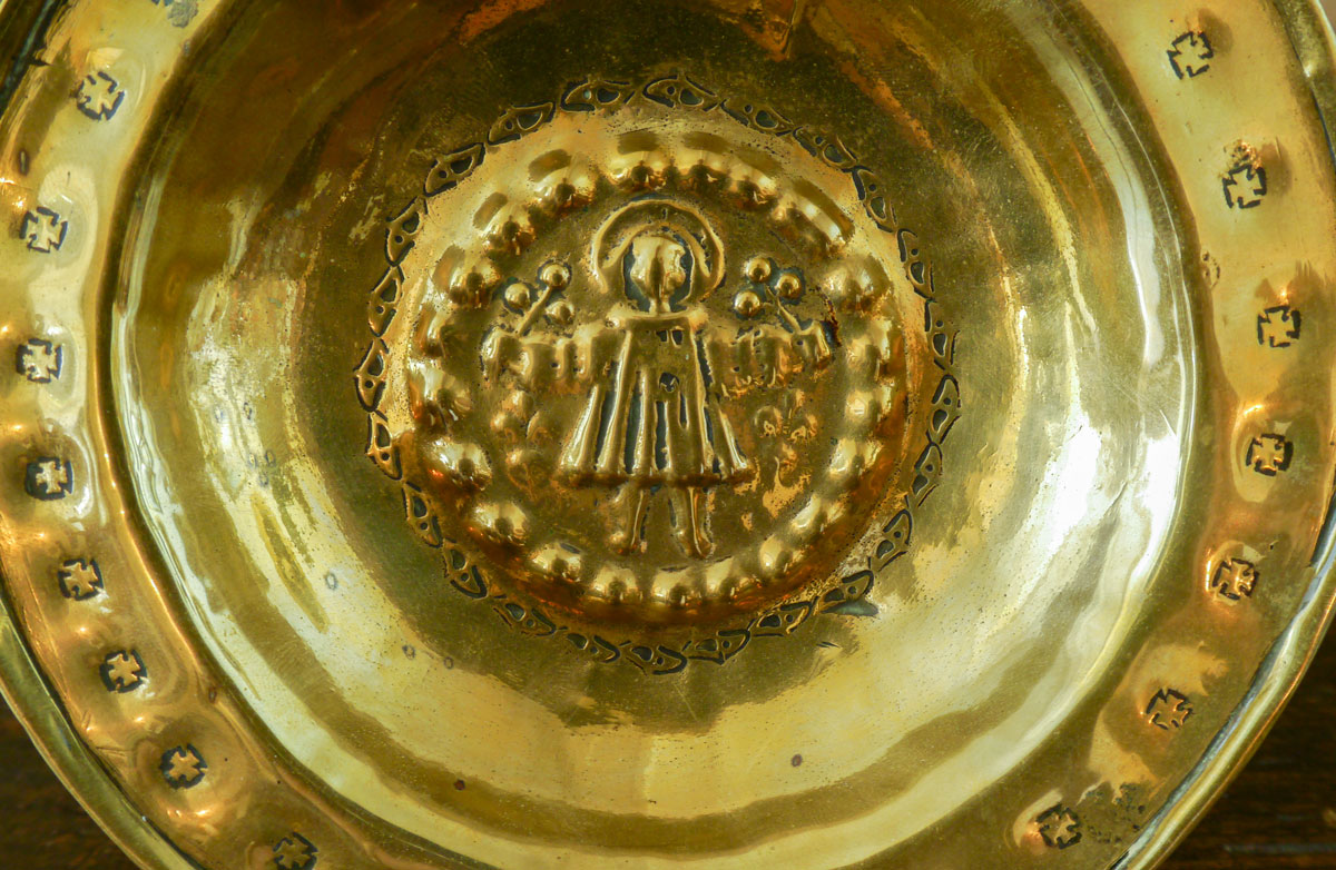 This unusually small alms dish shows the Christ child in the centre, arms outstretched, and a halo around his head. The rim has a band of punch-decorated crosses, there is some wear to the outside of the rim, but could be forgiven when considering the rare size - 6.5 inches (16.5 centimetres).