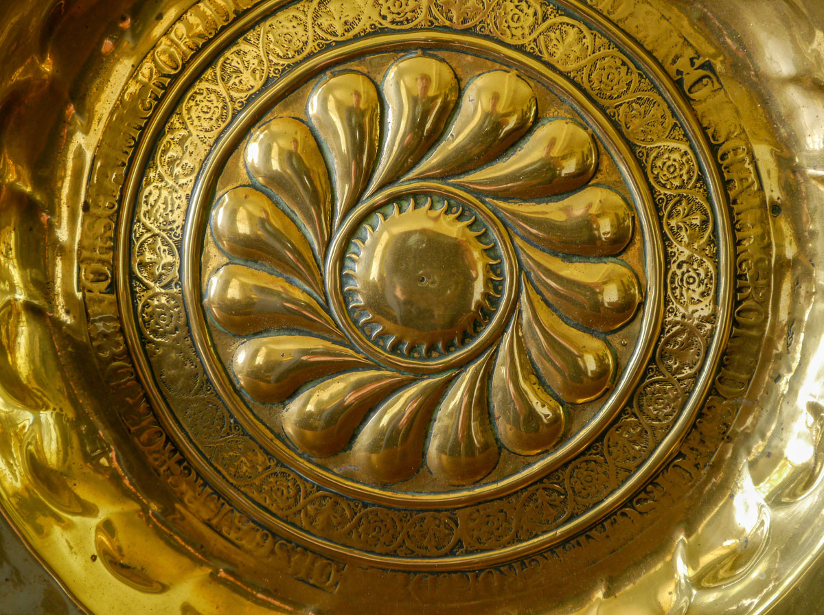 The swirled centre, with 15 ears, surrounded by an inner circle of flower heads and an outer circle of Gothic script. The gadrooned boodge rises to a slightly dished rim, with a punched decorated edge, which is rolled.
