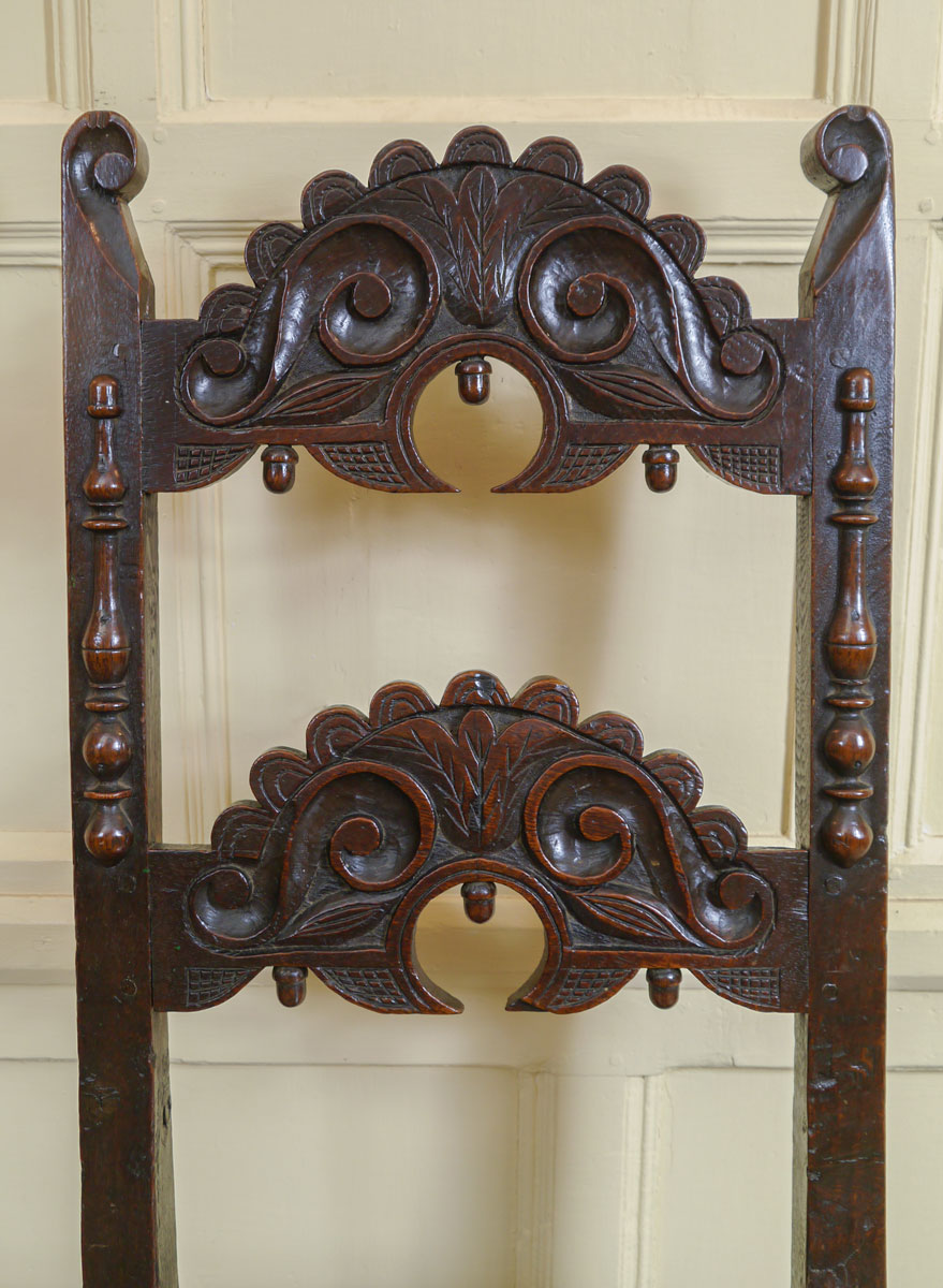 The back, with two horizontal scroll-carved arched splats, with wavy top edge, and hanging acorn pendants below, supported between two uprights with inward-facing scrolls to the tops. The uprights are decorated with unusually long split baluster turnings.