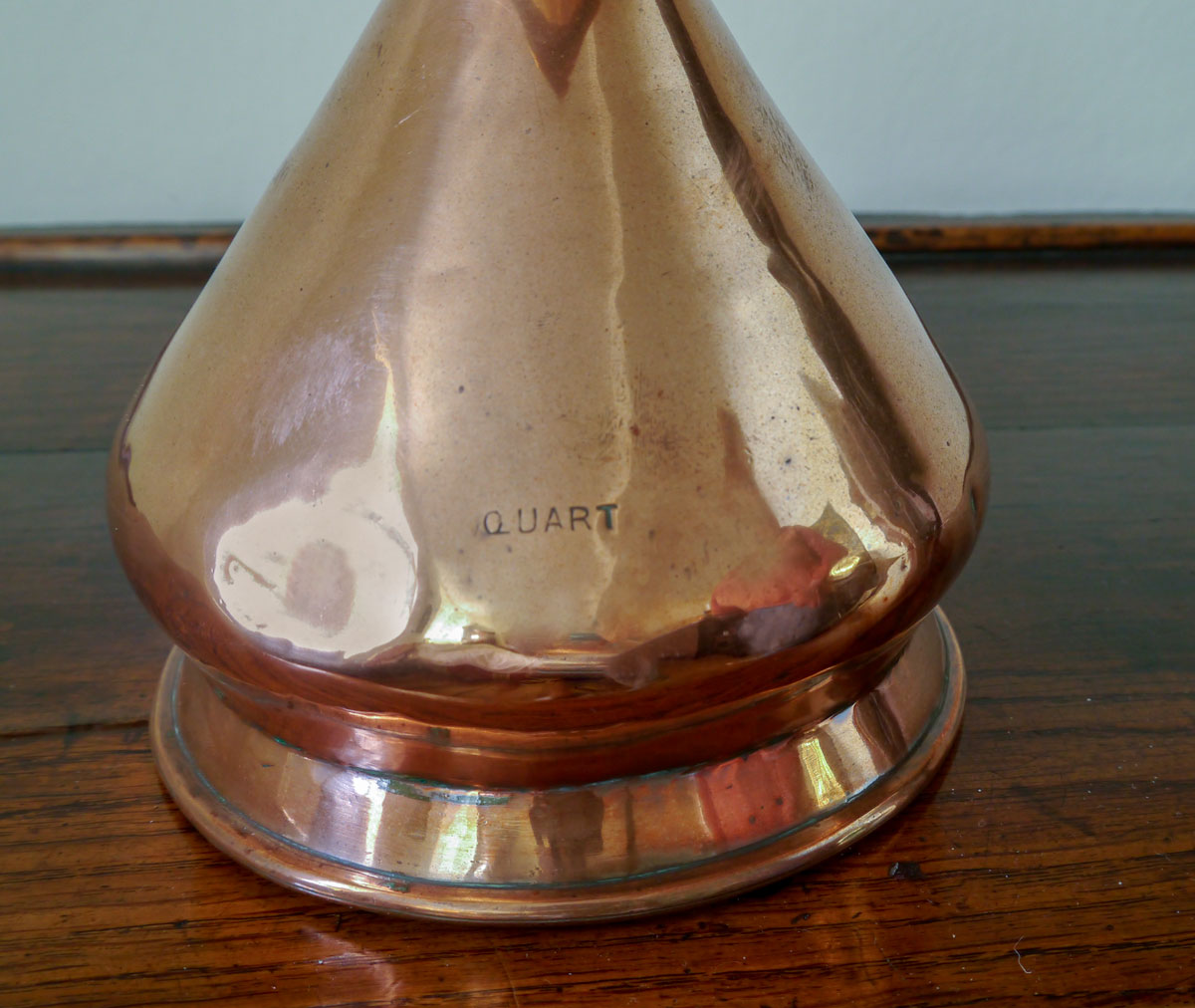 Of true “haystack” form – the flared body, stamped “Quart”, standing on a wide foot. The neck retaining the original “tinning”, with a lead weights and measures authentification mark.