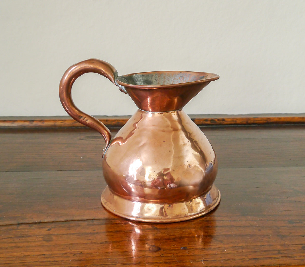 Of bellied form, with loop handle and flared neck. The body stamped for one pint.
