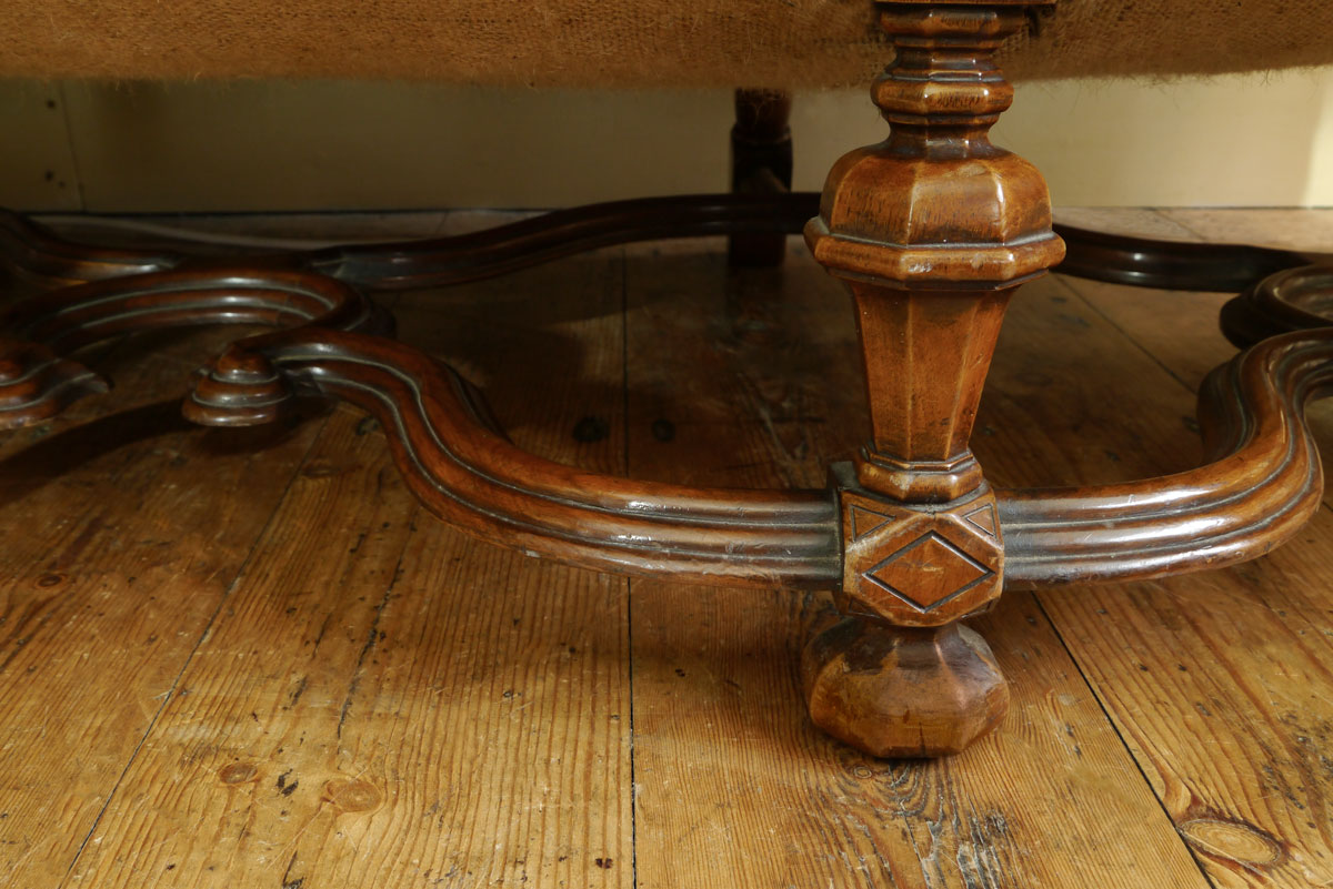 The legs are shaped and turned from solid walnut and joined by an X-shaped curving stretcher.