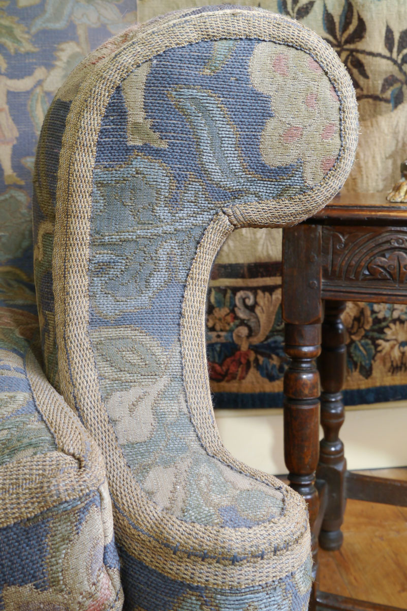 Having a rectangular back and shaped outcurving arms, which are upholstered in the original tapestry, woven with floral motifs, figures and exotic birds.