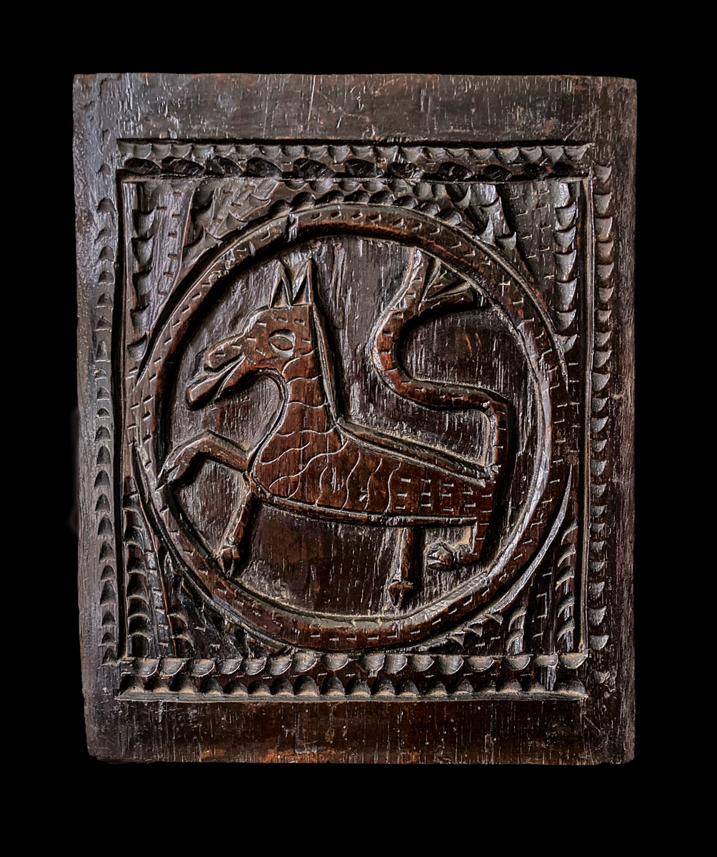 Whatever, the fellow sits within a roundel surrounded by a heavily chip-carved frame, all of which has achieved a really deep, rich colour.