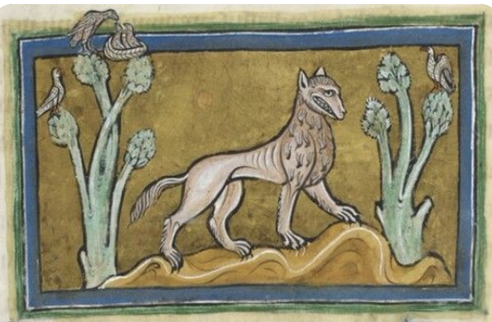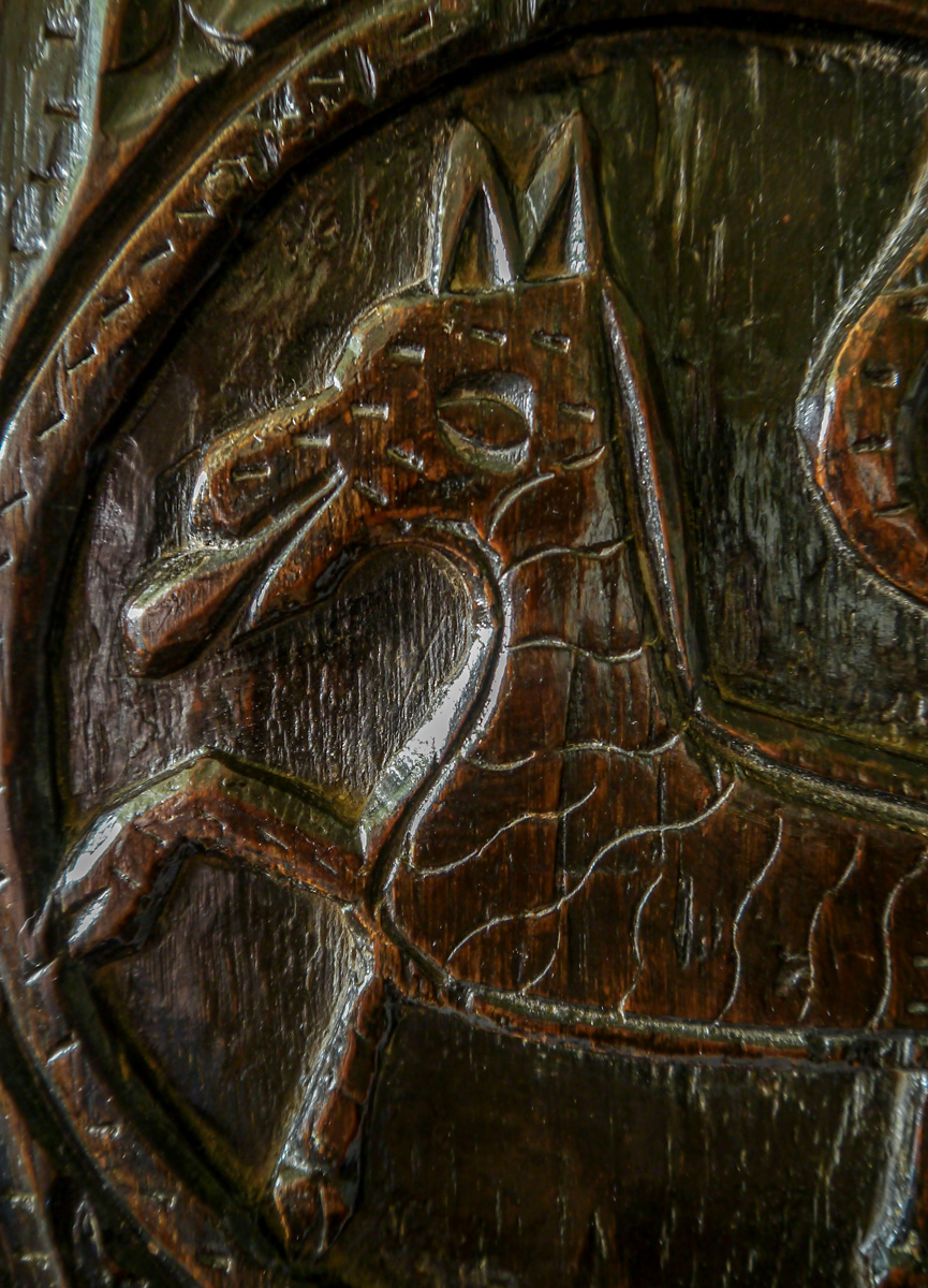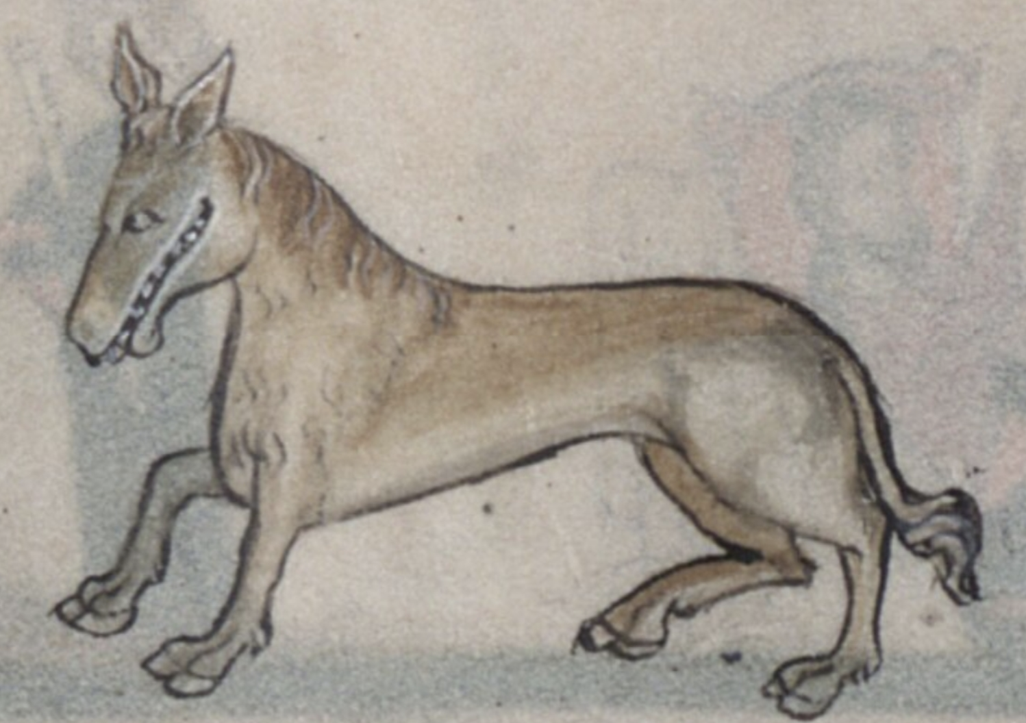 I am not convinced this panel depicts said beast – to my mind the demeanour is far too gregarious for an animal produced from a liaison between a lion and a hyena. Rather, I would suggest the animal is a well-meaning dog, with lolling tongue and sticking-up ears.