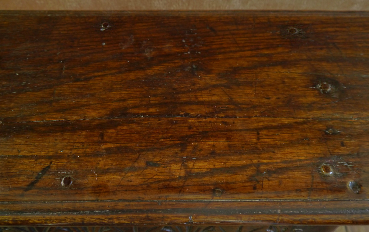 The two long rails have strong lunette-carved decoration, embellished with small punched stars, the two short end rails are deeply moulded along the bottom. Carving on benches is most uncommon - occasionally one rail is carved, but it is a rare exception to see both rails decorated.