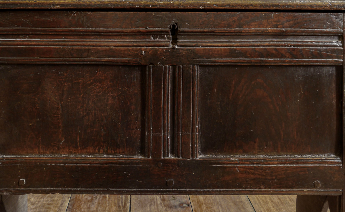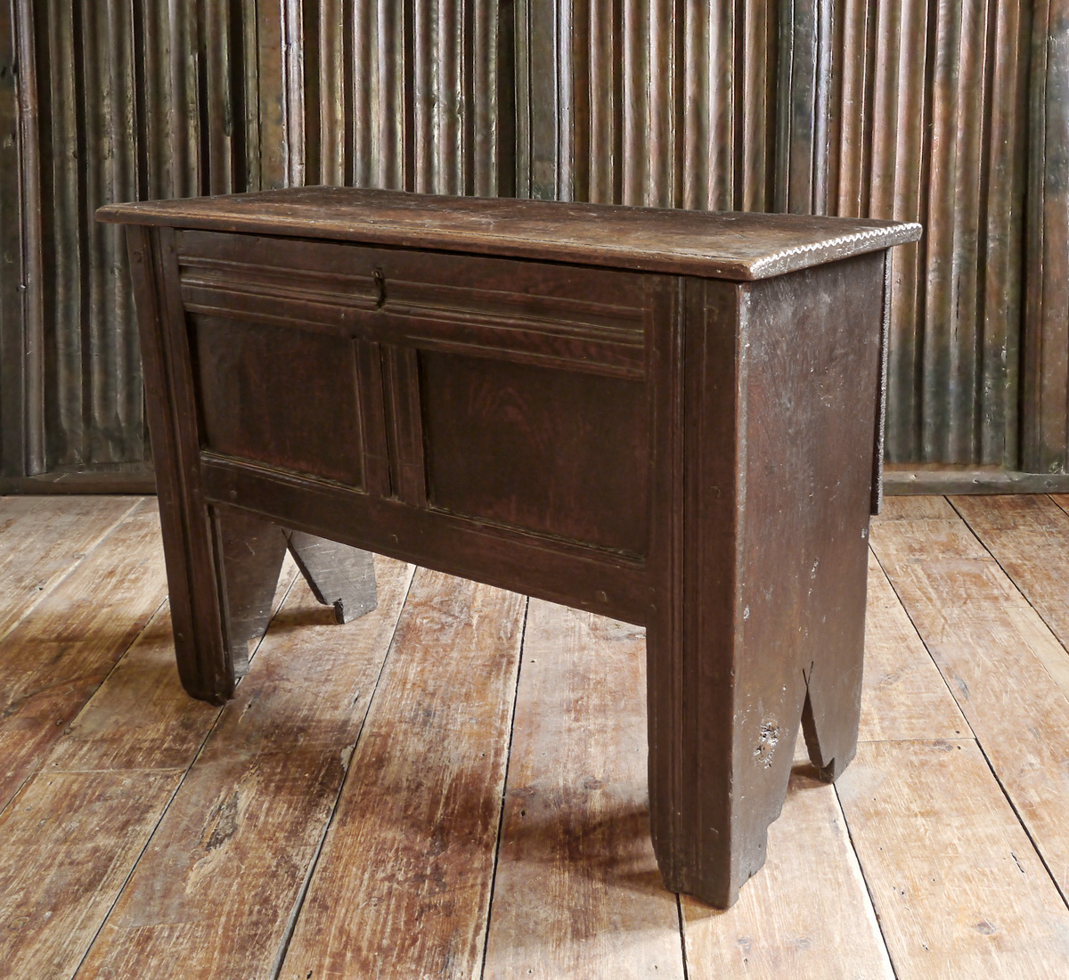 An unusually small chest, the single piece lid which retains the original iron pin hinges, has run-moulded edges to the front and back with chip-carved decoration to each end.
