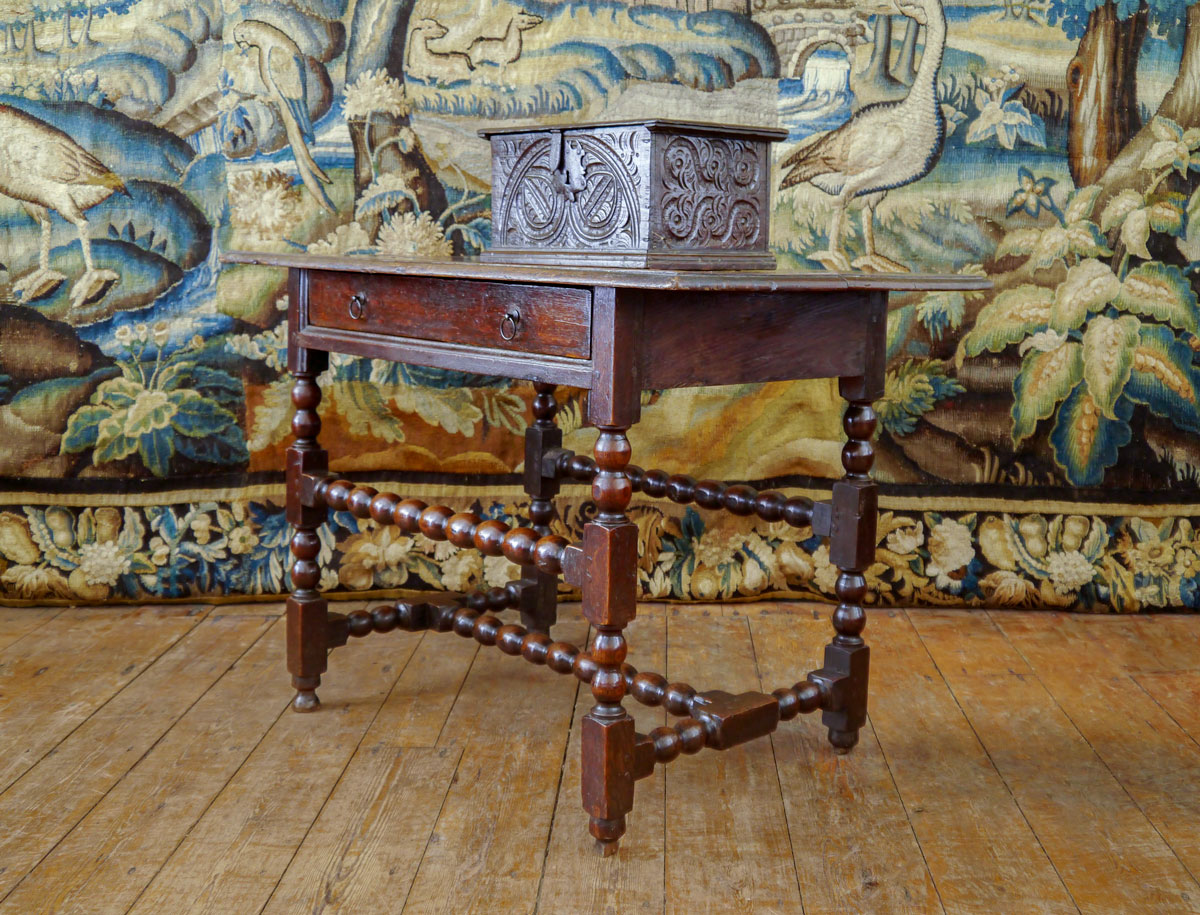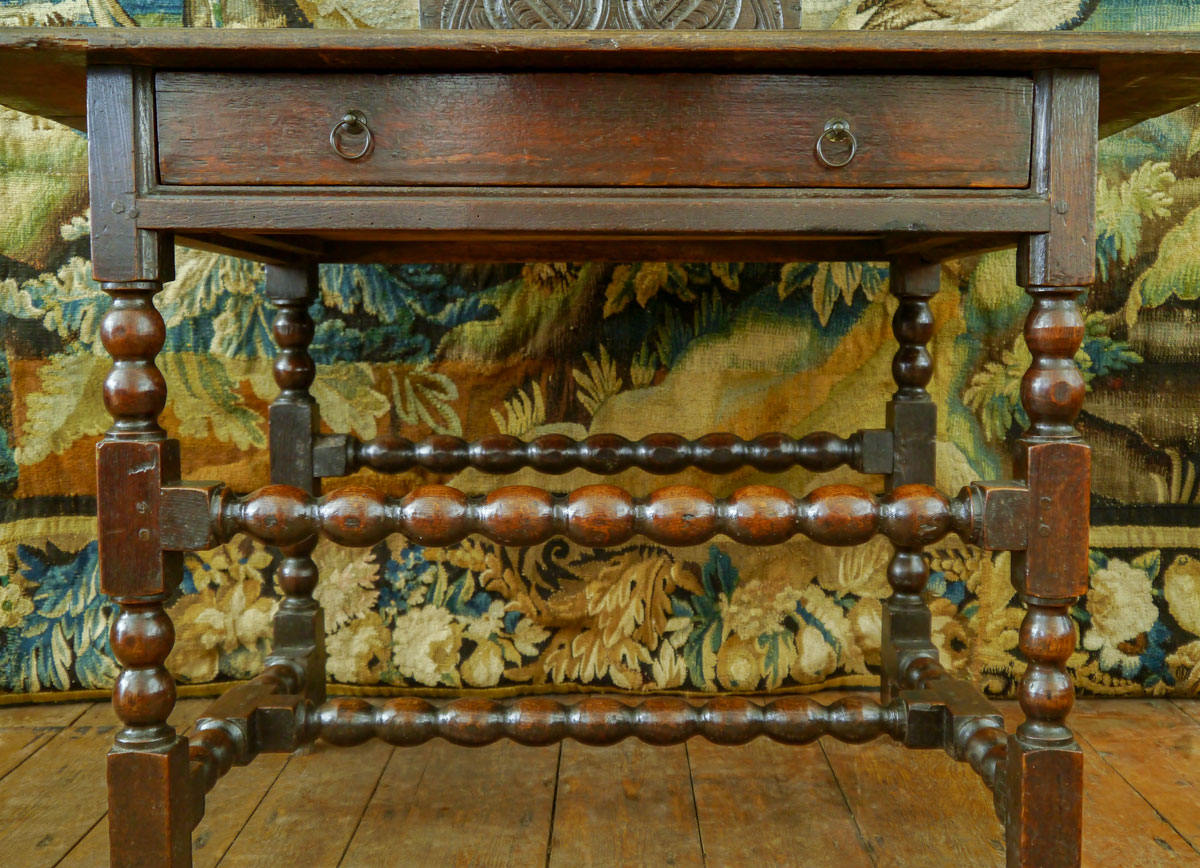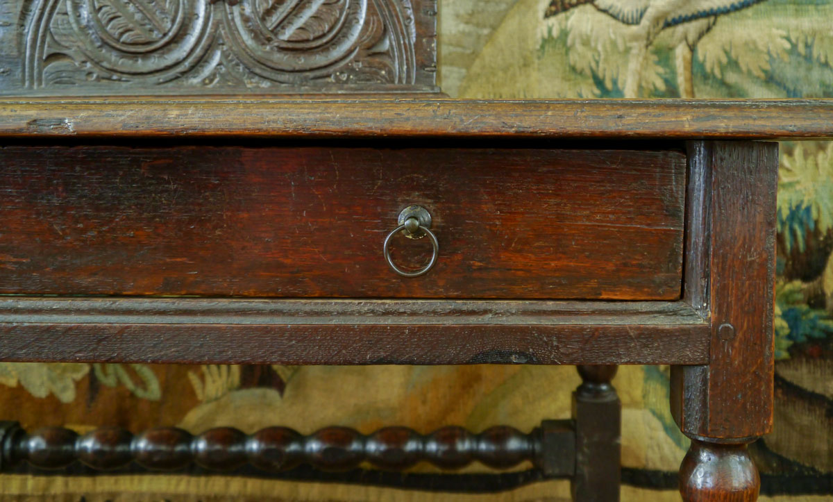 The two-plank top, with generous overhang, pegged to the rails with square oak dowels, and has a moulded edge on all four sides. Beneath the top is a single drawer set within a moulded frame.