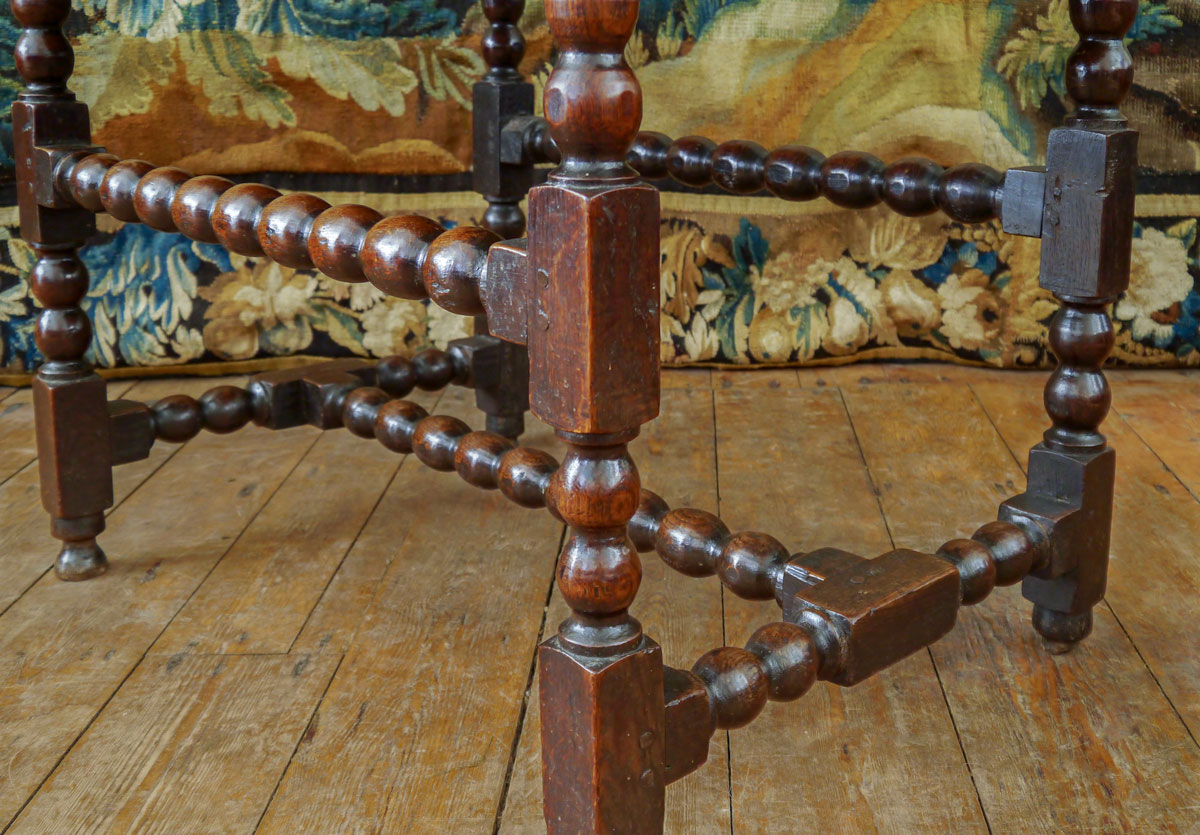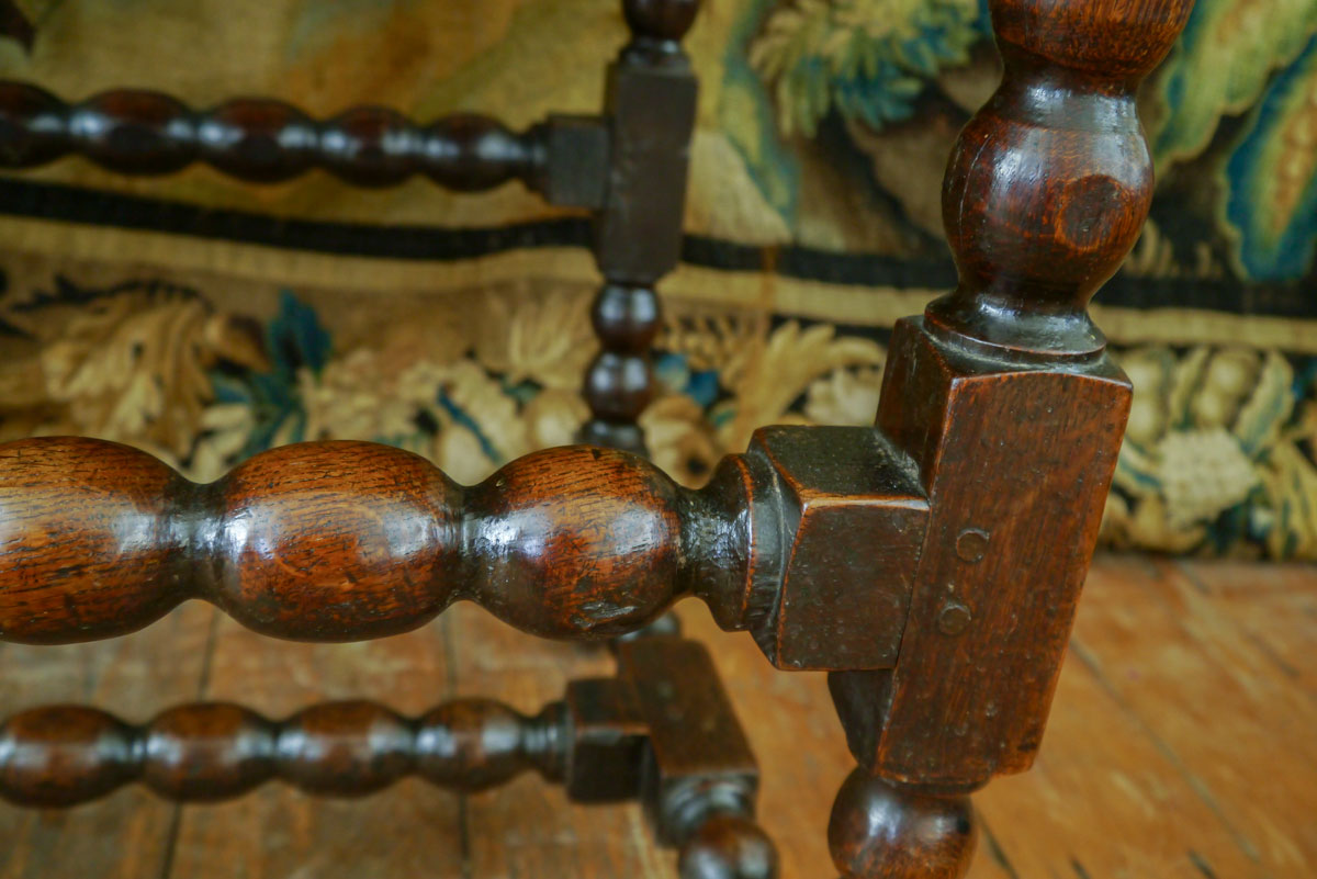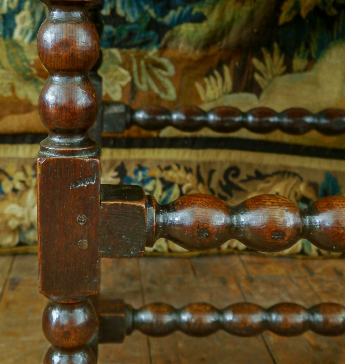 Each of the legs has a double-bobbin turning, separated by a square block into which the high level stretchers are morticed. It is most unusual to find all the stretchers turned, many just have the front with the turning, and the sides and back plain (see “Oak Furniture, the British Tradition” by Victor Chinnery, figure 3.244, page 313, for an example).