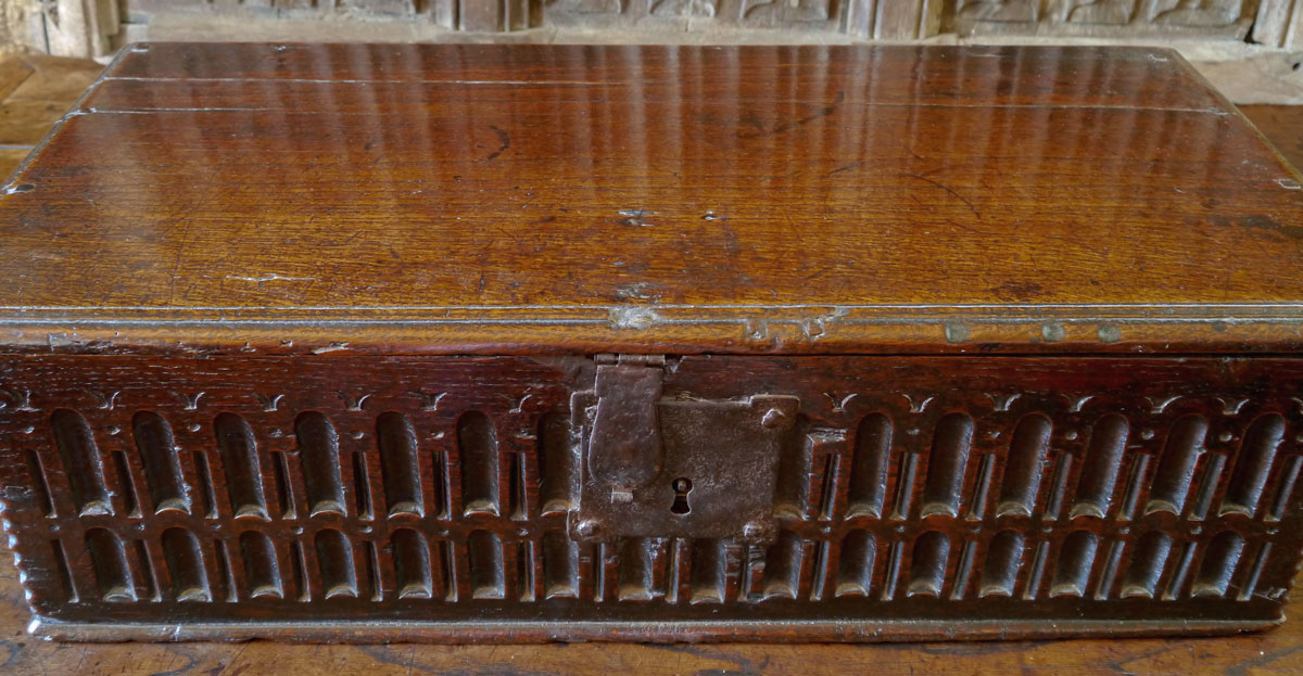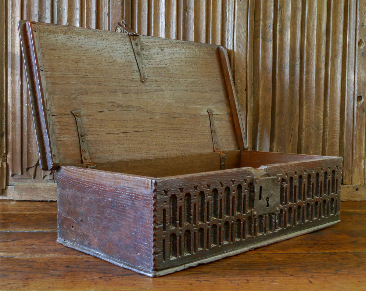 The shallow front board, with lockplate, complete with hasp and key, is carved with a double row of nulled decoration, the upper being slightly taller than the lower. The vertical end joints have fine chip-carved decoration.