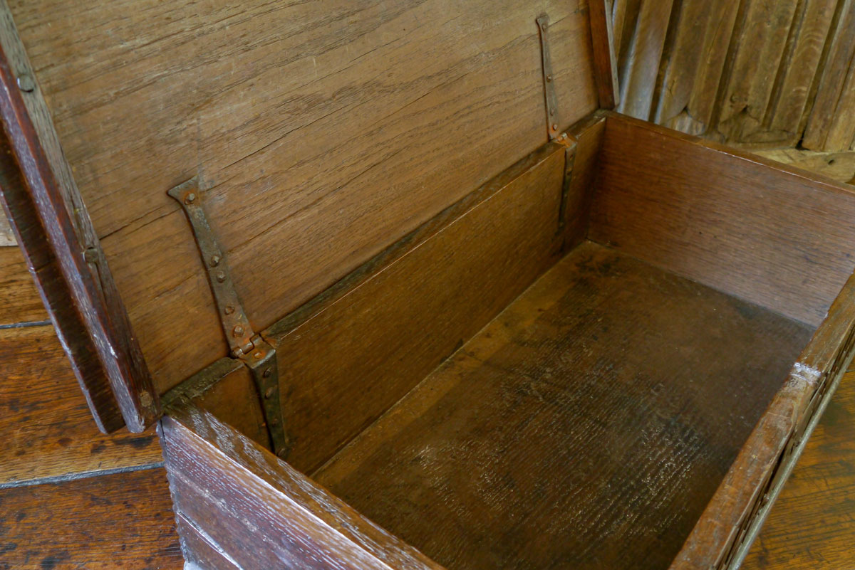 The single board lid, with a triple-moulded edge running all the way around, lifts on the original iron-strap hinges and retains a pair of lopers beneath the top, which are secured by two sets of four square oak pegs.