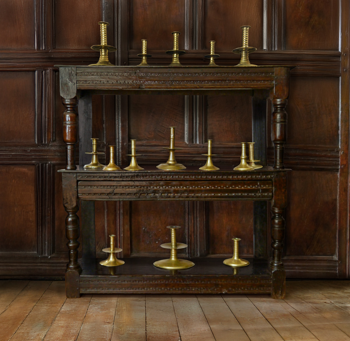The cup board is decorated with a collection of brass 17th century trumpet-based candlesticks.