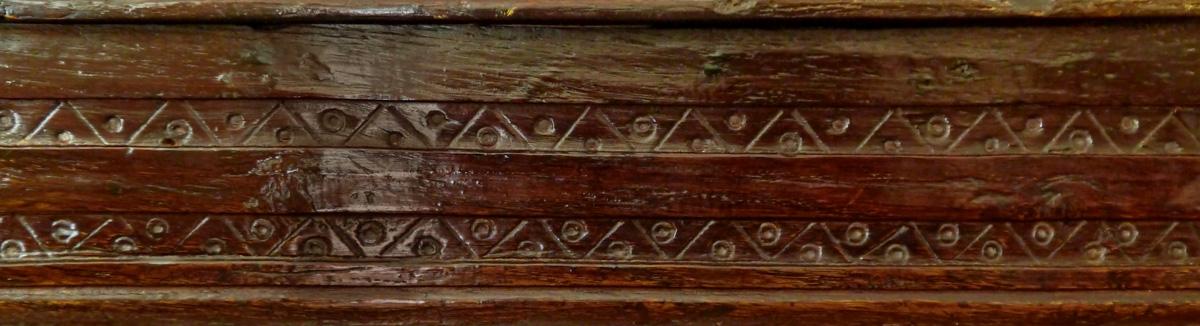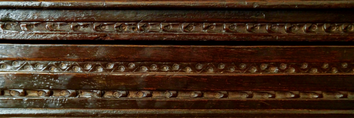 The front and side rails are decorated within the run mouldings, within simple chip carving, embellished with stamp decoration.