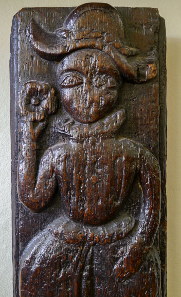 Having a flamboyant wide-brimmed hat, simple ruffed collar, tunic and exaggerated pantaloon trousers. The male figure, with his left hand to the front of the pantaloons, and his right hand upright holding a stylised flower head.