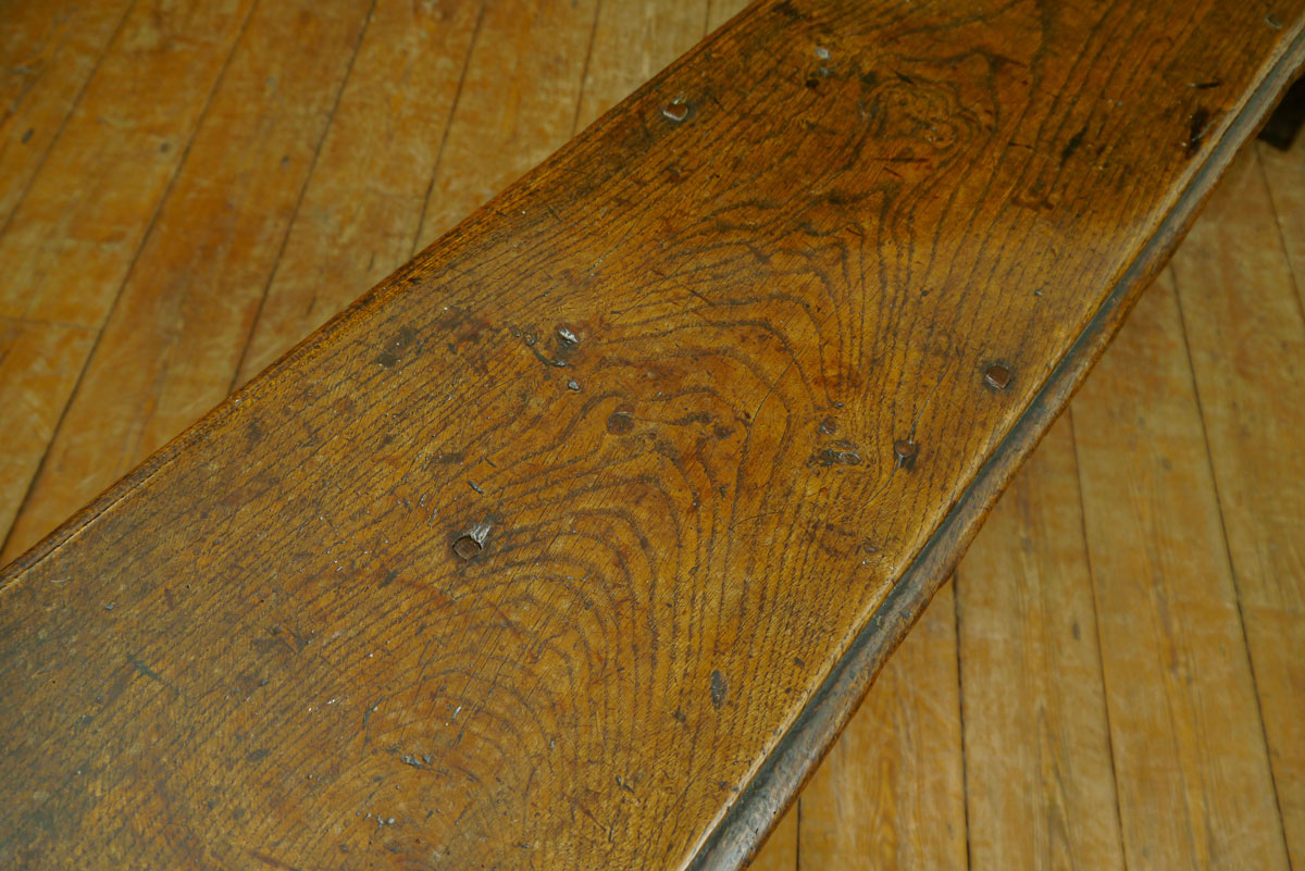 The well-grained single plank top, having a deep moulded edge, is secured to the seat rails by 10 square oak pegs.