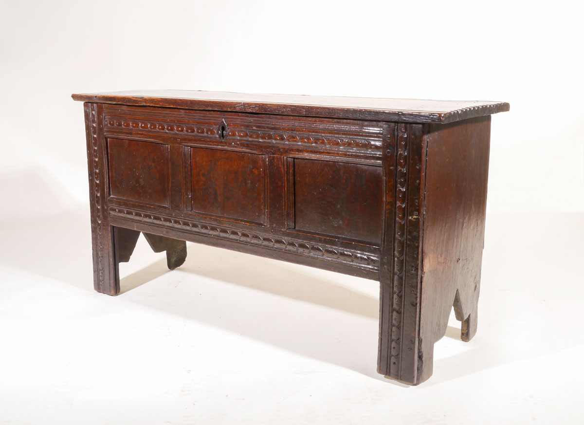Having a boarded top and ends, the panelled front is decorated with simple chain carving. Lovely proportions.