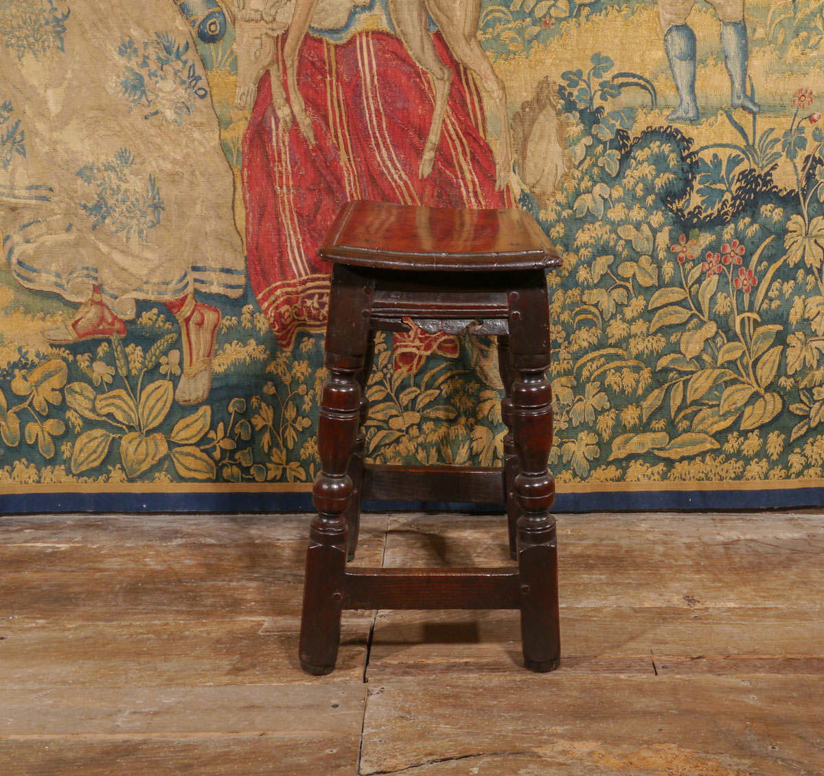 The boarded top of this impressive stool is secured by four pegs and supported on shaped and run moulded rails. The well-turned inverted baluster legs are joined by all round stretchers.