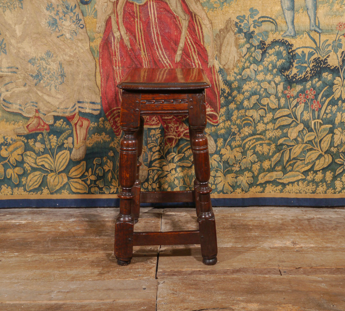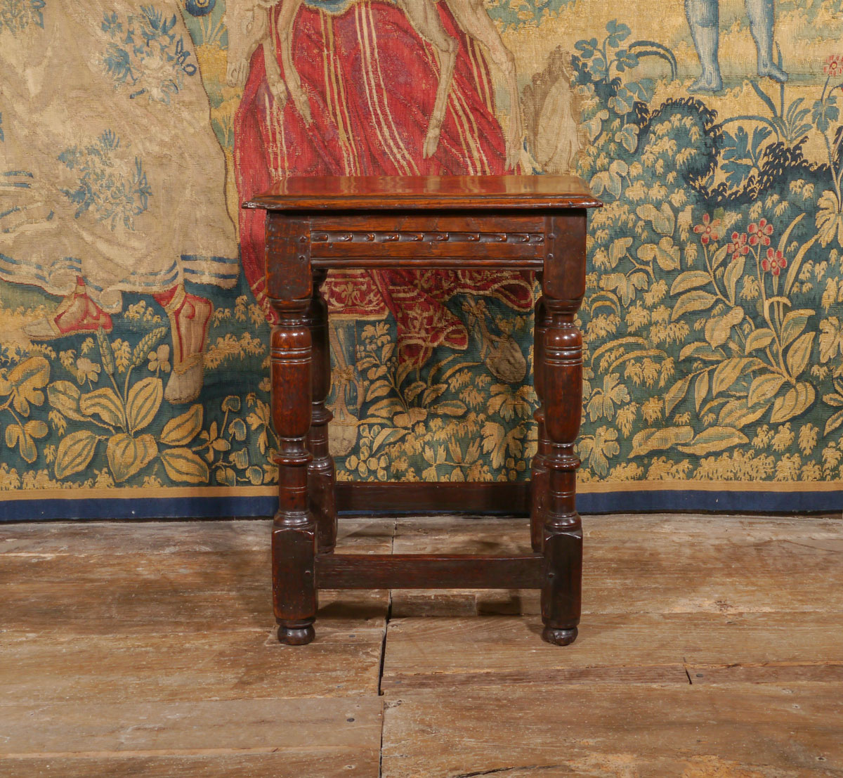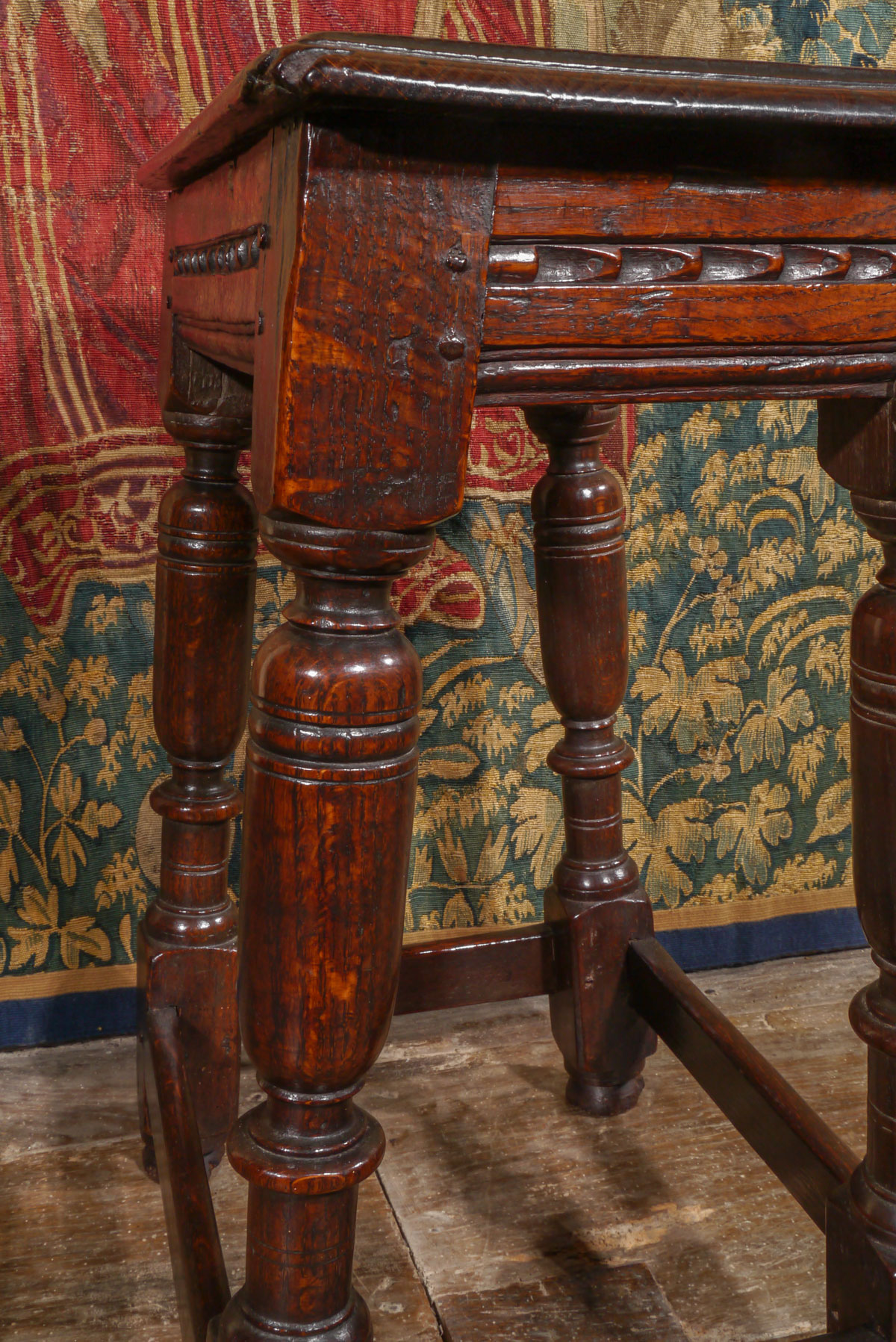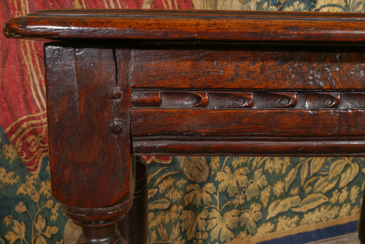 The boarded top, having a good double moulding around the edge, and secured by four square pegs. The moulded rails have a central band of chip or gouge carving and are set between very well-turned baluster and reel-turned legs, which terminate in the original turned toes. The legs are joined by all round stretchers.