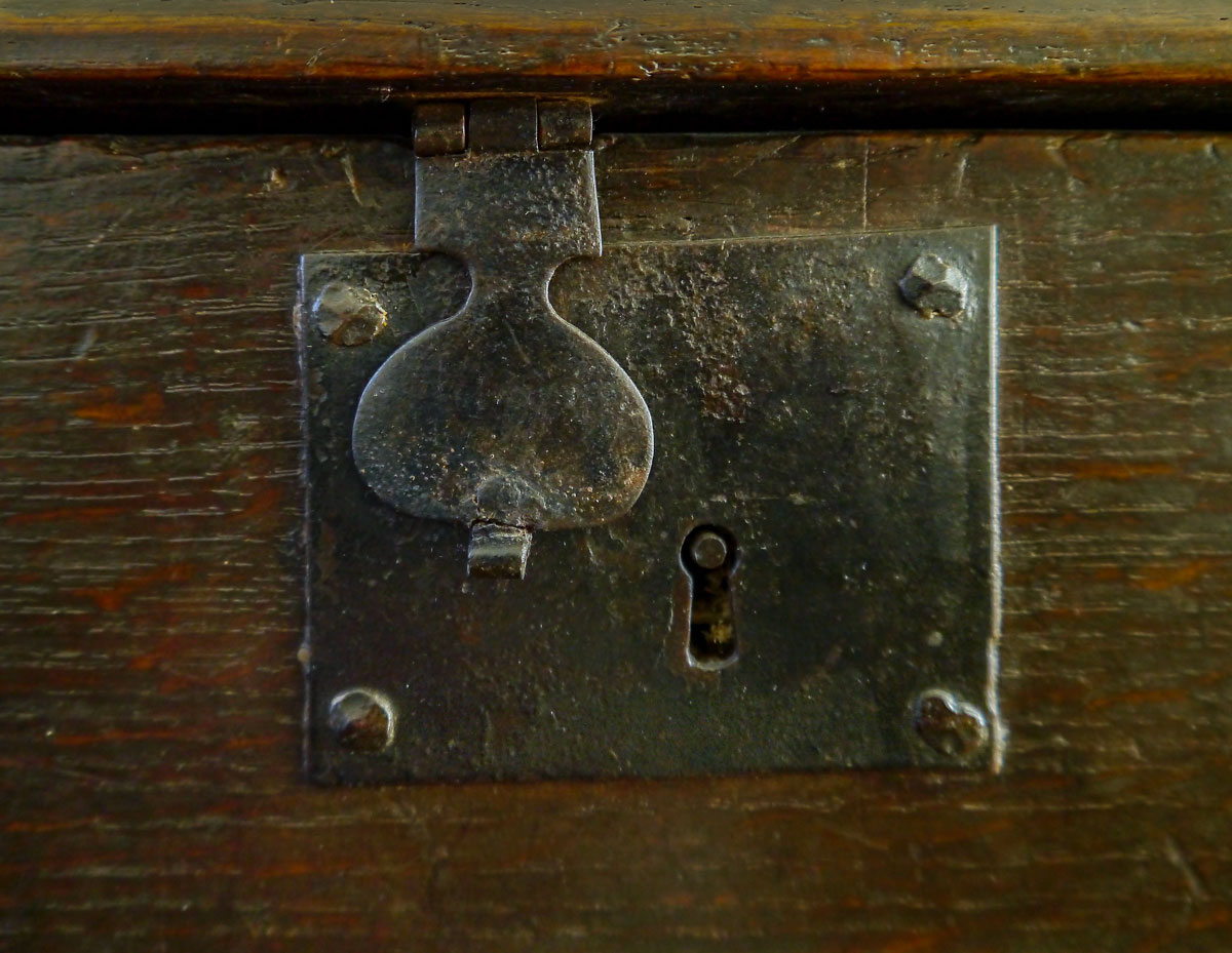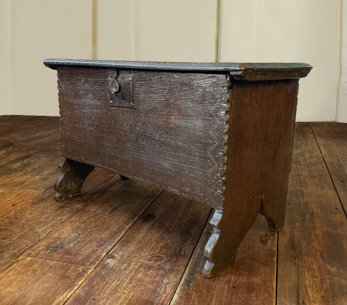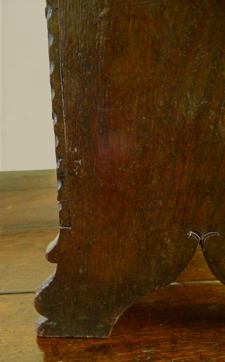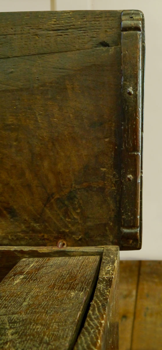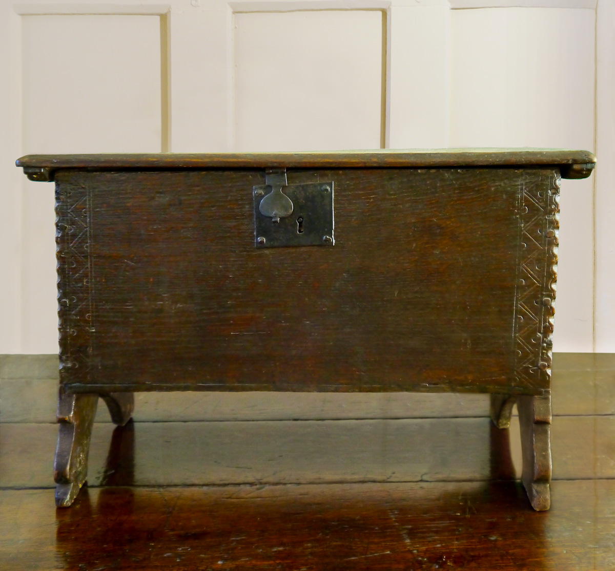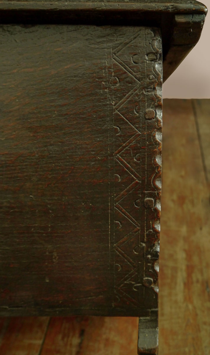 The front board has chip-carved decoration to each end, with a vertical border of scratch carving, in a "zig-zag" pattern. The original iron lock plate, with its hinged hasp, is retained in the centre at the top. The front board is fastened to the boarded ends by two sets of four square oak pegs (the back board is secured in the same way).