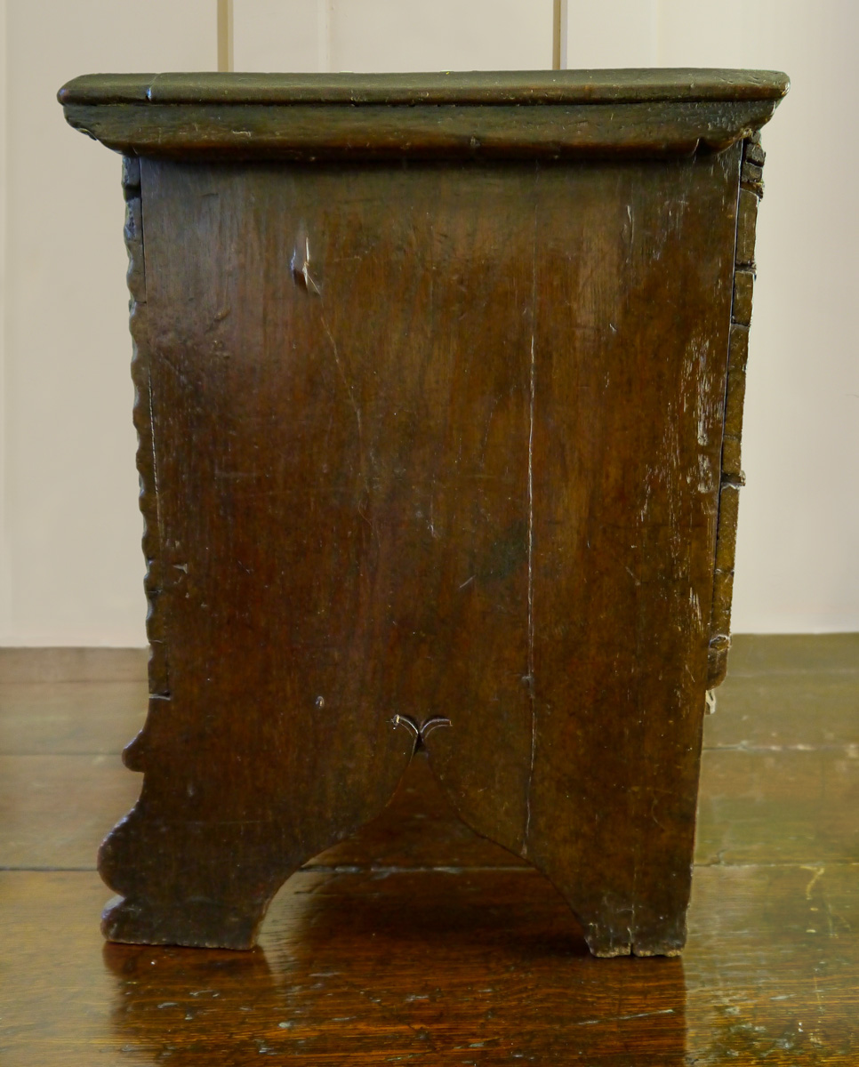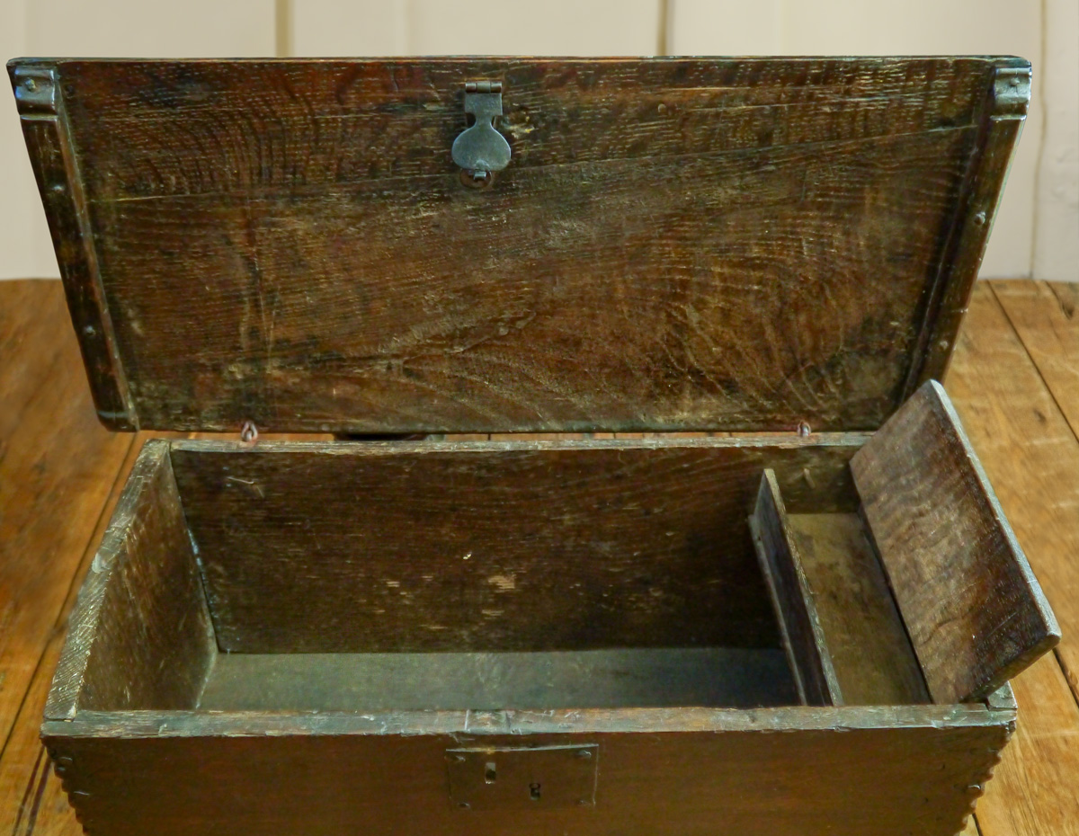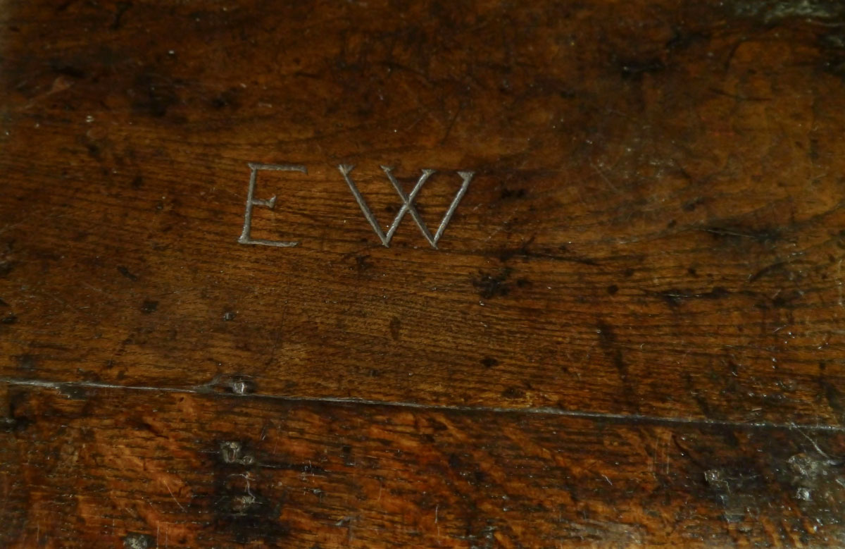 The boarded top (carved with the initials of the original owner) opens on pin hinges to reveal an interior with a candle box, or till, to the side. To the underside of the top are two shaped lopers, secured in place by iron nails.