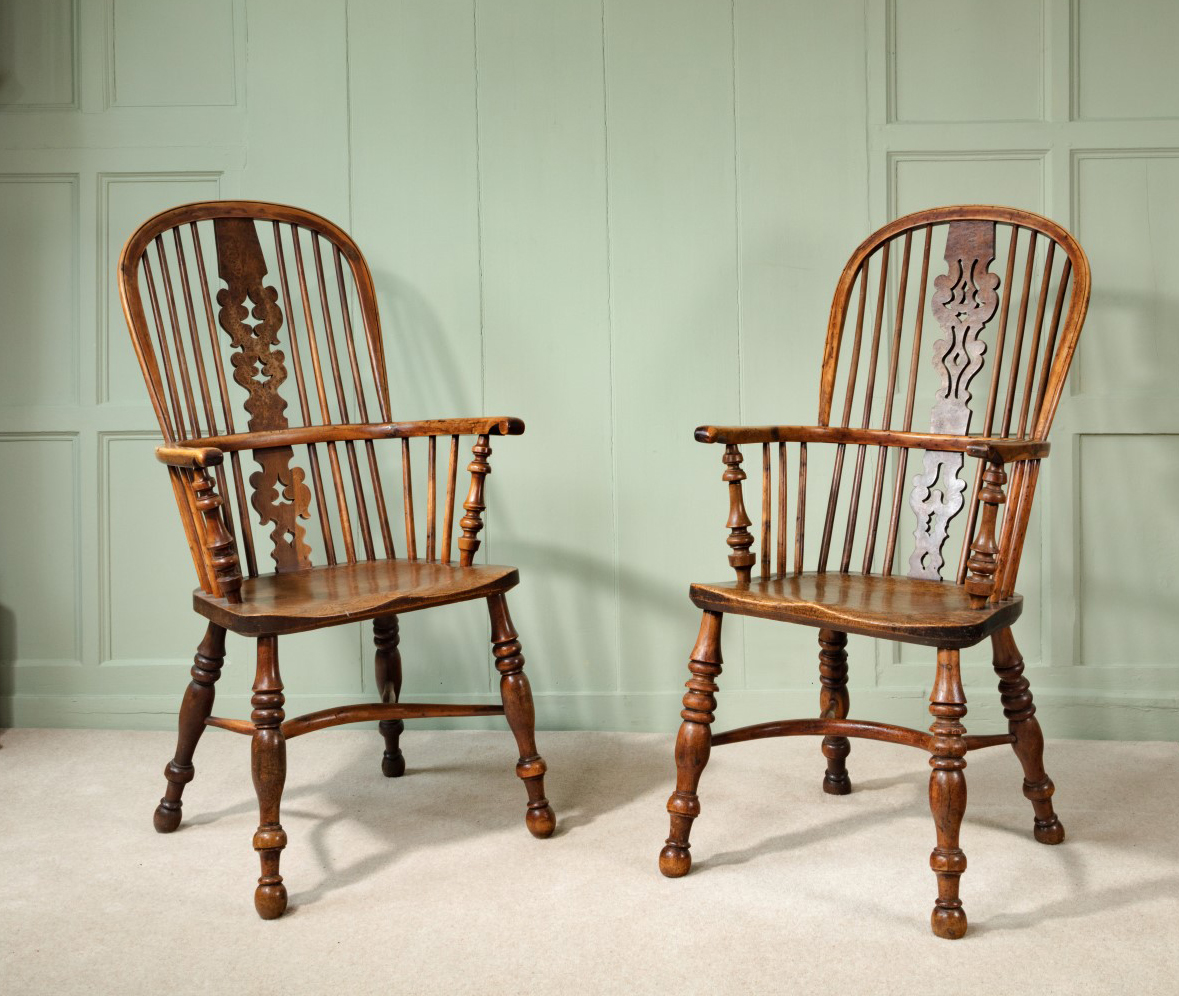 Two truly rare and amazing High Back Windsor Armchairs, which have been together since they were made in the middle of the nineteenth century. It is my belief that the two chairs were made by either the Allsop, Gabbitass or Godfrey families of Worksop, to show the two designs of "Best High" chairs that they made (perhaps as an advertisement or for a trade show). One chair has the Christmas Tree splat, whilst the other shows the Decorative Pierced splat. The yew wood used in both examples is identical, with the splats being fretted from pieces of burr yew. The leg turnings are correct for both type of chair, the more complicated turning matching the heavily pierced Decorative splat, whilst the Christmas Tree chair has a slightly simpler turning. The arm supports are identical. Worksop, circa 1840-50.