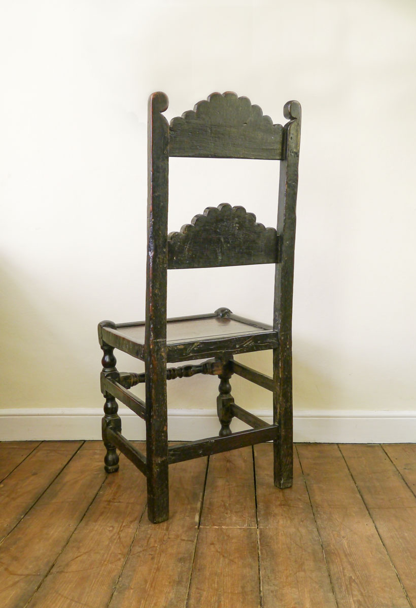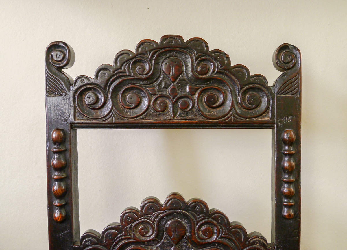 The twin horizontal splats, richly carved with scrolls around a stylised face, or mask – often thought of as that of Charles I. Most unusually on this type of chair, the splats are flat across the bottom, and not upwardly arched as is normally found. The uprights decorated with bold split balusters, and terminating in inward-facing scrolled finials.