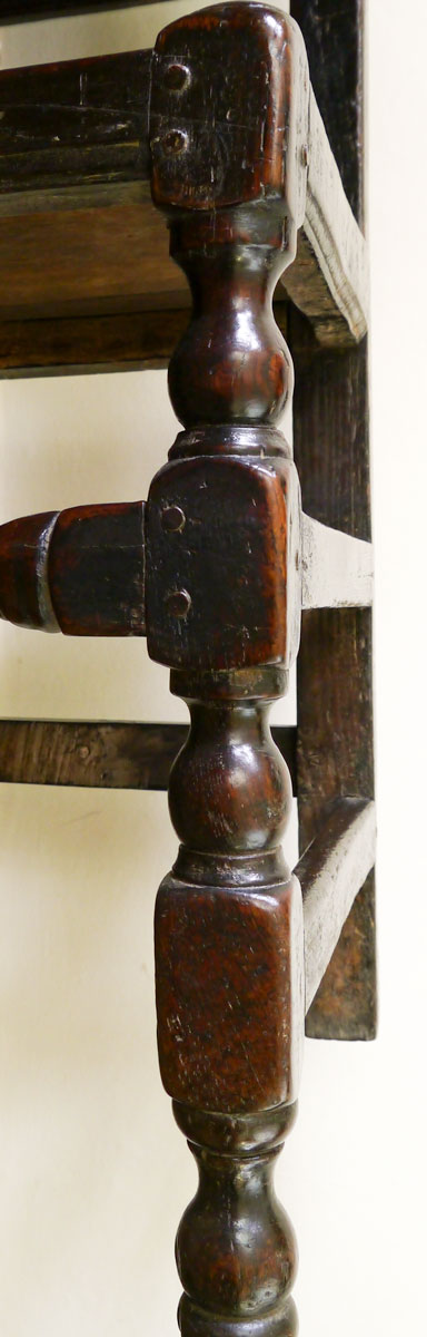 The boarded seat, inset within the rails, and supported on heavy turned baluster legs, joined by a similarly turn cross stretcher. The legs terminate in a very unusual “double foot”, and the whole being of excellent deep and dark colour.