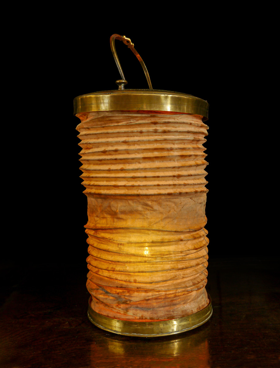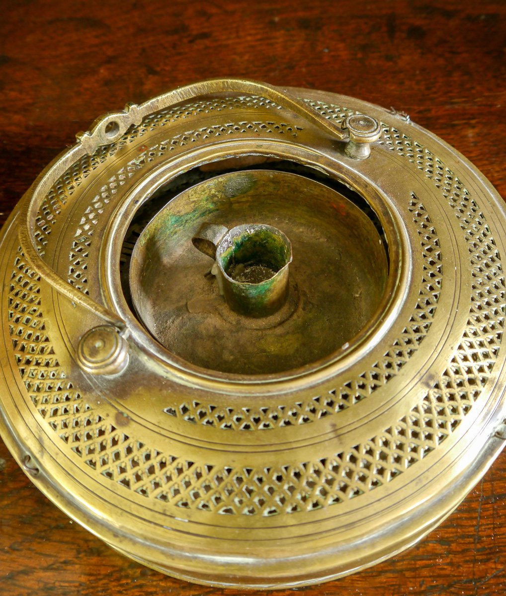 Two short brass “posts” set into the pierced cover are used to locate a hooped carrying handle, which when lifted pulls a linen shield up and around the candle, to protect the flame from drafts, which may be encountered as the device is carried along gloomy unlit passageways, as the owner moves from room to room.
