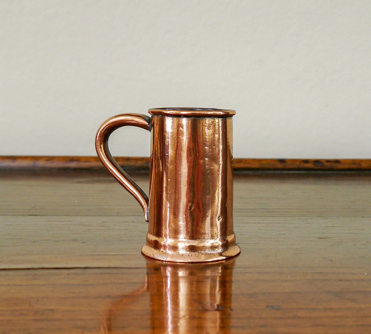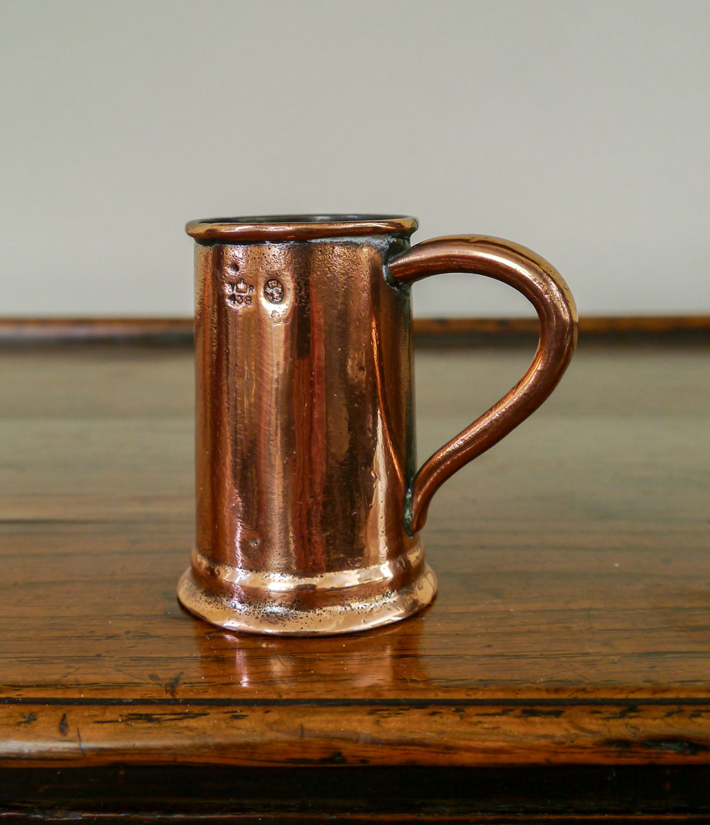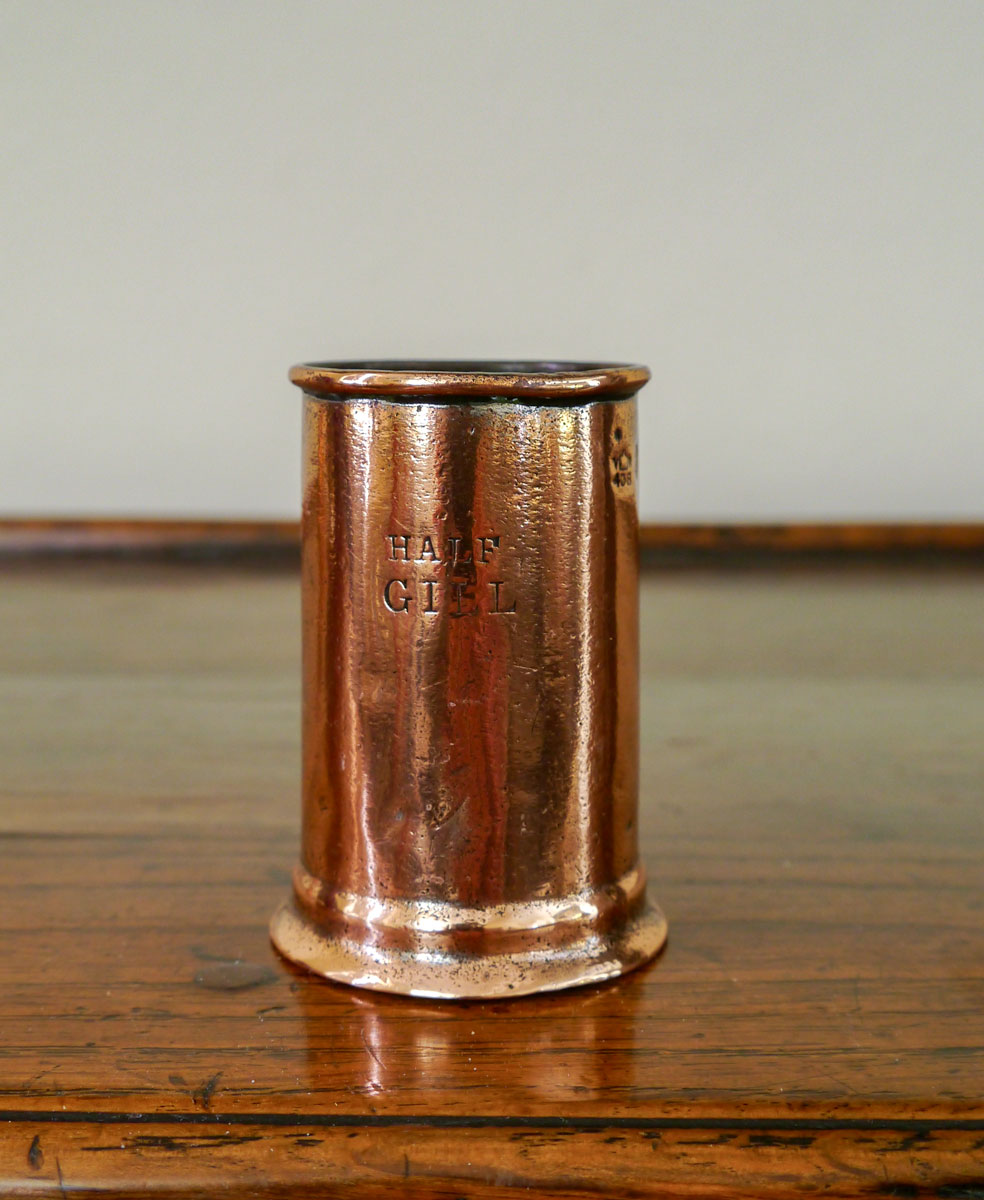 The slightly tapering drum, with a loop handle, stamped for half a gill. Also to the side is a Victorian verification mark for weights and measures.