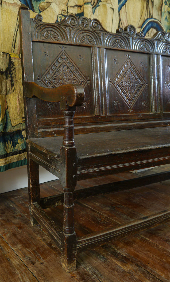 The triple panel back, with large central lozenge carving, decorated with whorls in the corners, below a wonderfully shaped top rail, with six carved lunettes, each with a stylised leaf centre, and further punch-decoration. The scrolling crest to the top rail is a most unusual feature – very reminiscent of crests found on wainscot chairs of the same period.