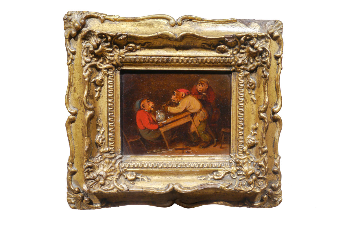 Three early 19th century oil on board caricatures of monkeys in slightly humorous scenes, all in the original carved and gilt frames.