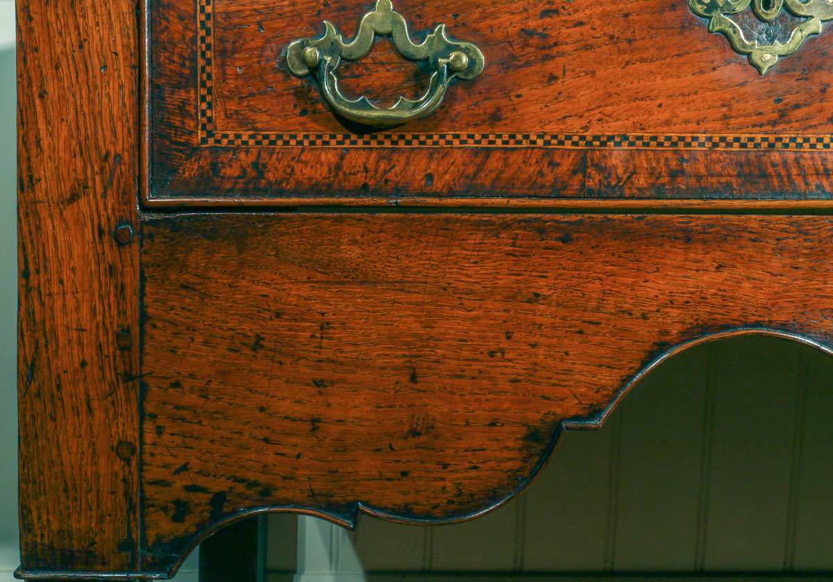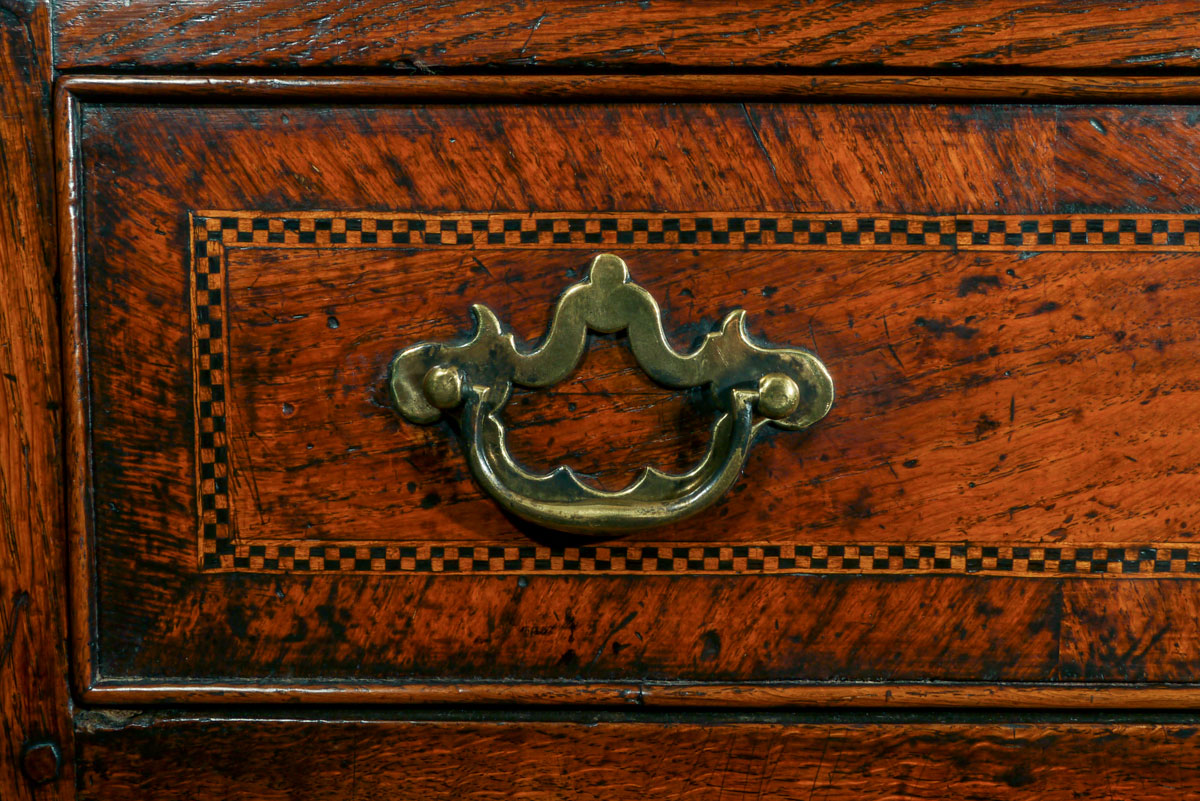 The two plank top, with moulded edge, above three drawers, all with holly and boxwood chequer line inlay, within pollard oak cross banding. Beneath the drawers is a deep and finely arched frieze, with an applied cock-beaded edge. The piece stands on four well-turned baluster front legs, with simple square legs to the back.
