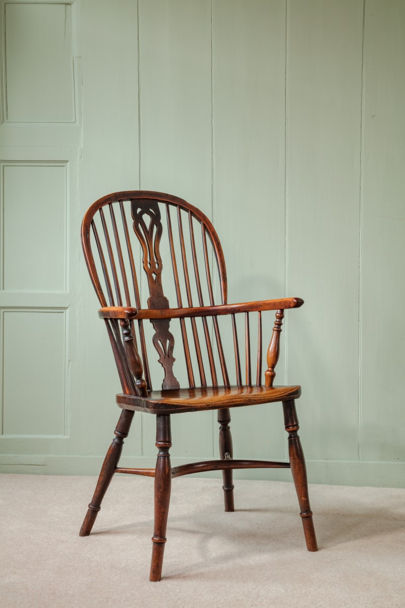 An early 19th Century yew wood Windsor armchair, of very pleasing proportions and unusual construction. The spindles around the back mortice all the way through the seat and are then cut off level on the underside. This method of construction is found in late 18th Century and early 19th Century chairs. The single-ring leg turning, together with the three-ring arm turning, would suggest the place of manufacture to be Rockley, and the early construction technique would suggest it was made by Rockley's first chair maker, William Wheatland.