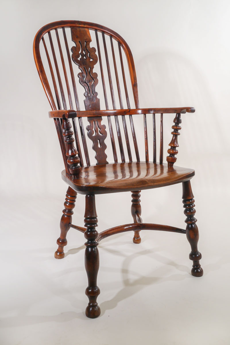 Excellent 19th century yew wood high back Windsor armchair with exceptional shaped fretted splats. Good arm and leg turnings.
