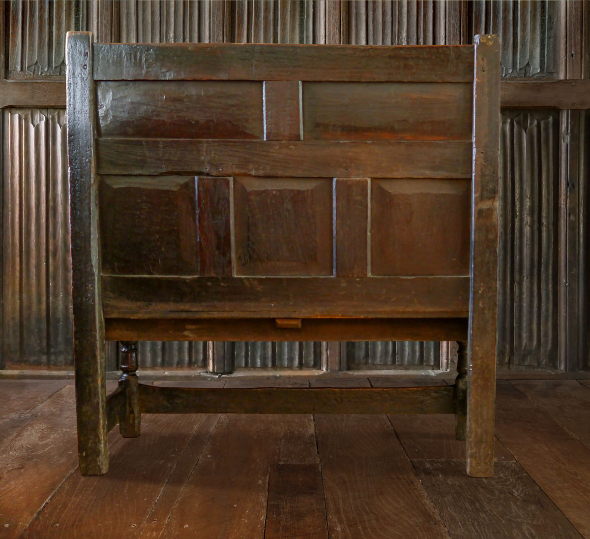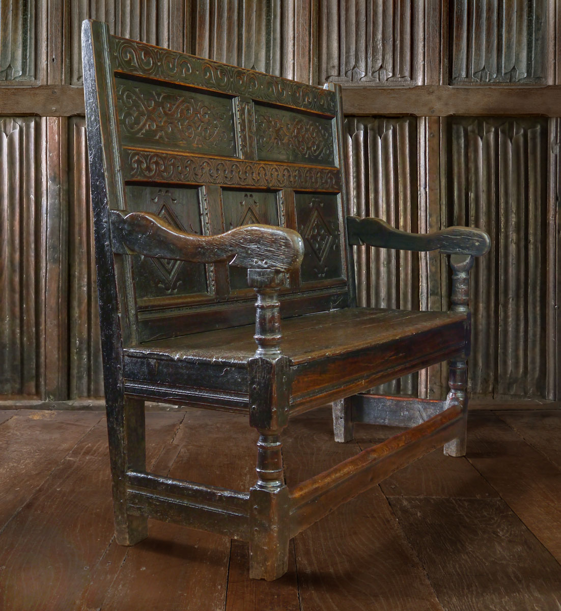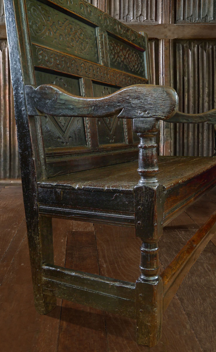 The seat is constructed from 2 oak boards, which sit on deep rails with a run-moulded decoration. The legs have short, stout turnings which are a continuation of the arm supports; around the bottom is a robust stretcher which again is run moulded.