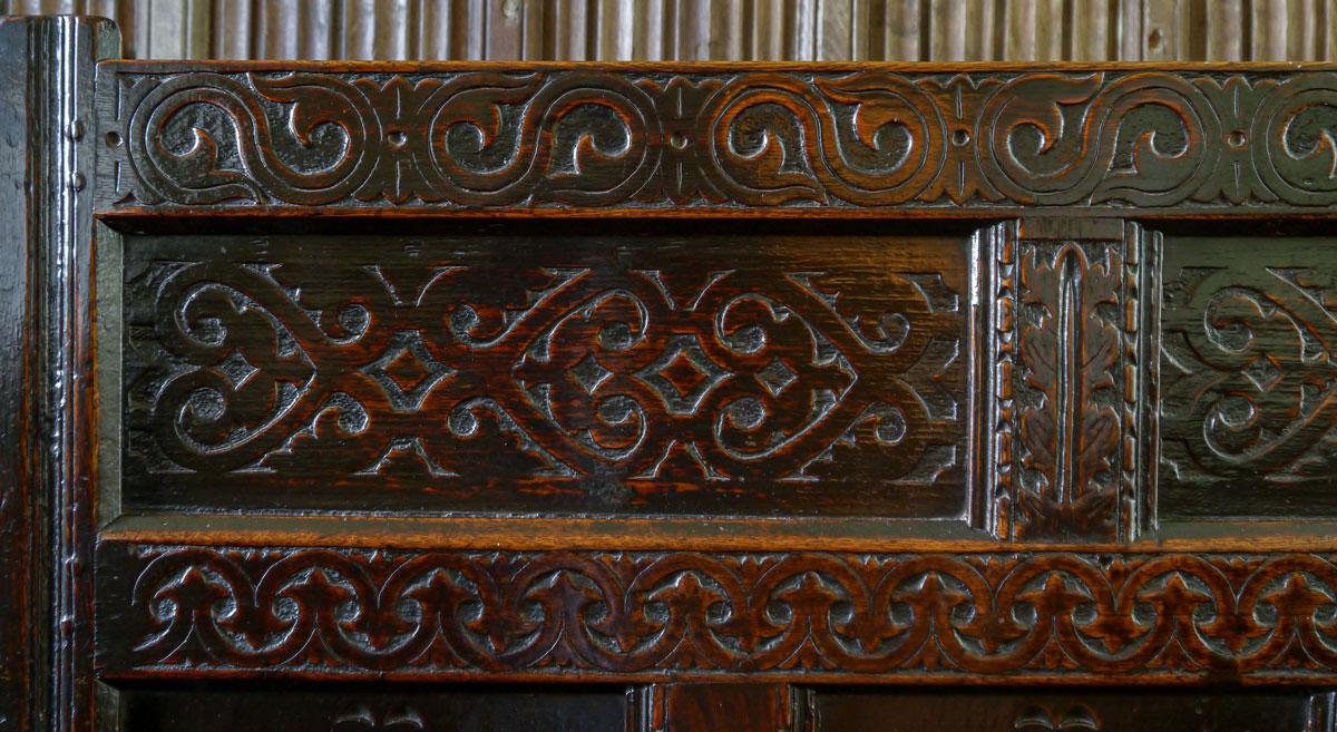 The 3 square panels above the seat are carved with well-defined lozenges – the flying pendants coming from each point of the lozenge are a detail of pieces made in the Yorkshire Dales.