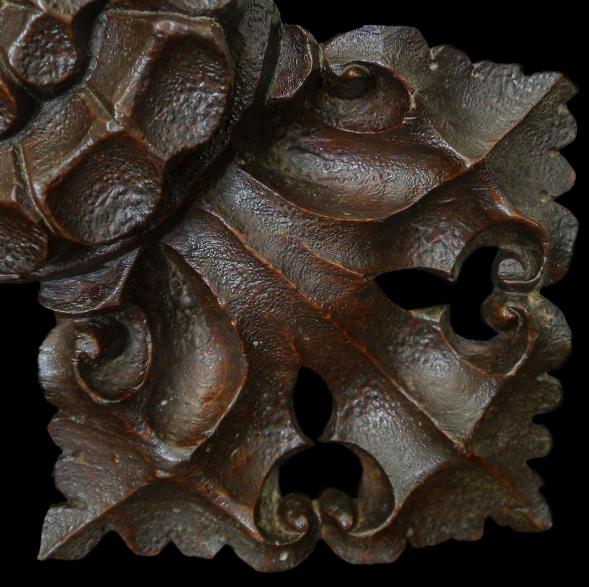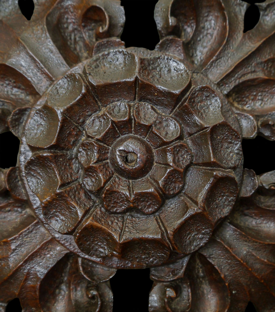 Of quatrefoil design, each quarter depicting a leaf, deeply carved with scrolls around clover leaf piercings. The raised centre, richly carved in the form of a Tudor rose.