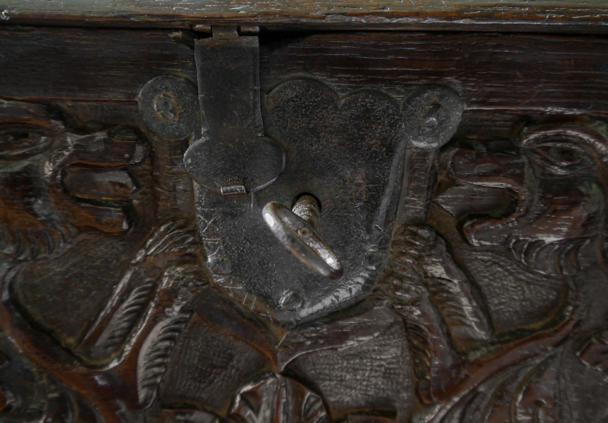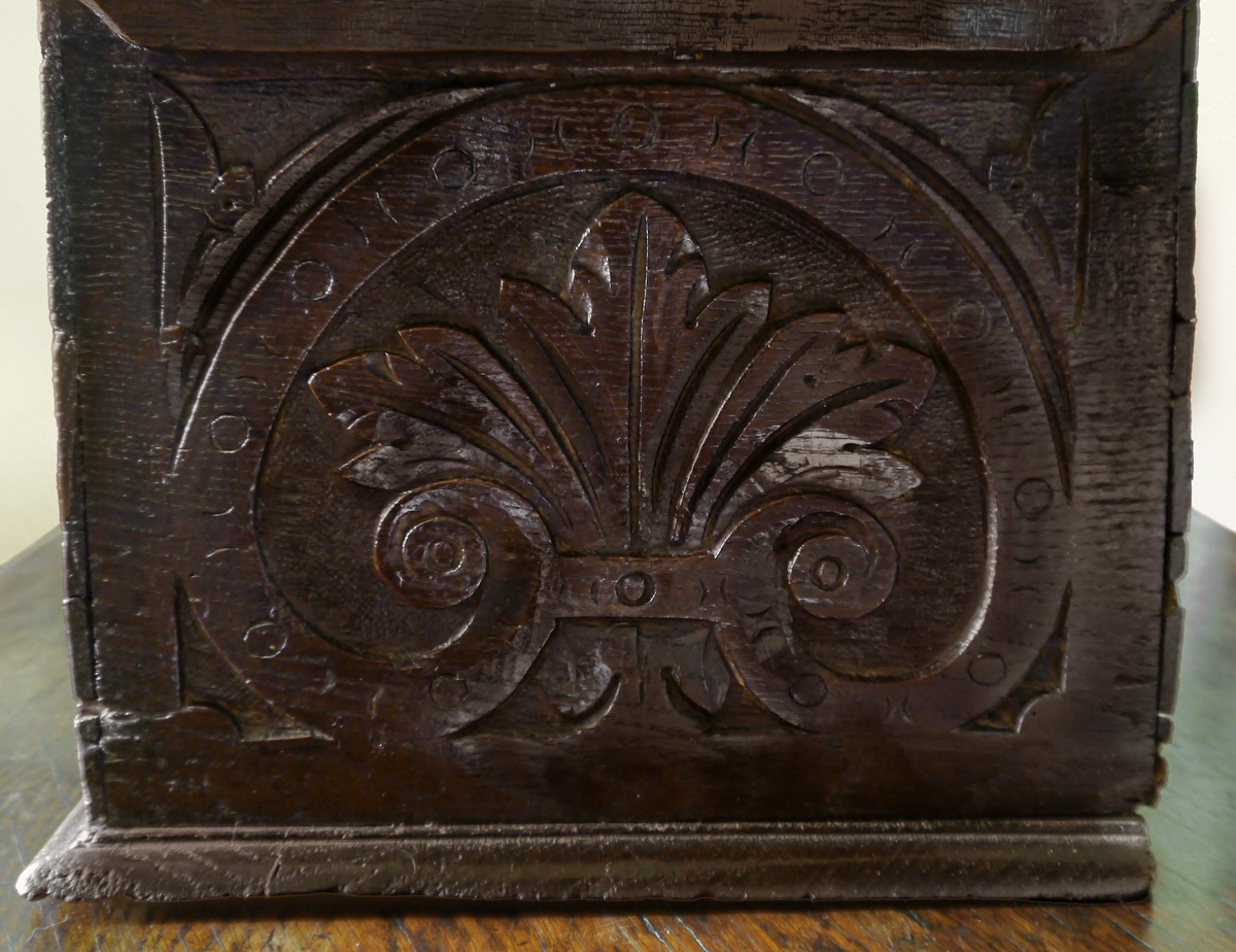Having a single board top with moulded edge, and shaped “lopers” to each end, opening on lovely wire hinges, and retaining an iron hasp, with penny end. The carving to this early box is quite exceptional – the front panel shows two mythical beasts, possibly stylised dragons, facing a superbly shaped central lock plate, which retains the original key. Their scrolling bodies terminating in tales formed from a fleshy leaf, and acorns.