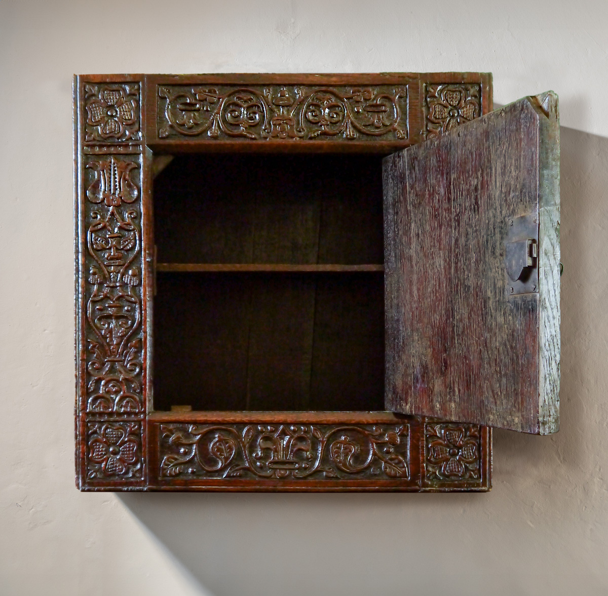 Made at the beginning of the 17th century, this is probably one of the earliest wall cupboards and an outstanding piece of English oak.
