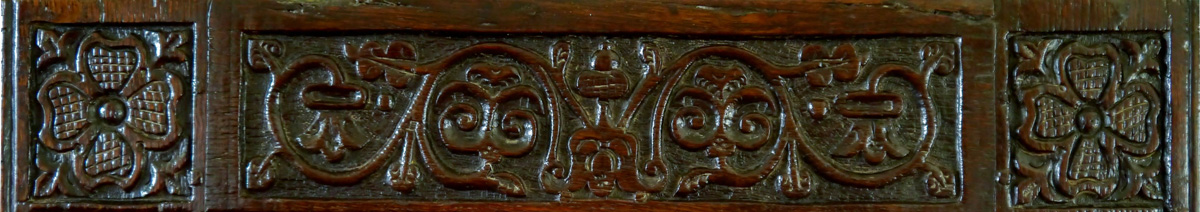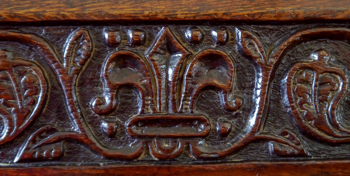 The rails of the cupboard are superbly carved with a stylised rose in each corner. The sides carved with a matching decoration of gilly flowers above scrolls, acorns and leaves. All supported on upturned semi-circles (a motif which is copied at the bottom of the marquetry panel). The top rail has floral carving – leaves, flowers and a central acorn. The bottom rail beneath the door is exquisite, having a central fleurs de lys, with scrolling stems, leaves and flowers.
