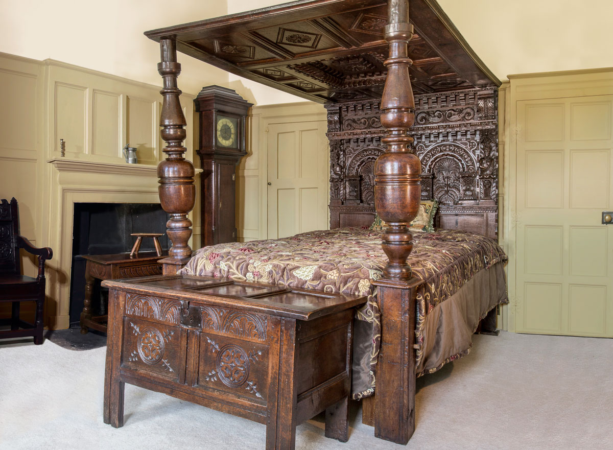 A rare and intricately carved tester bed gives character to a bedroom setting.