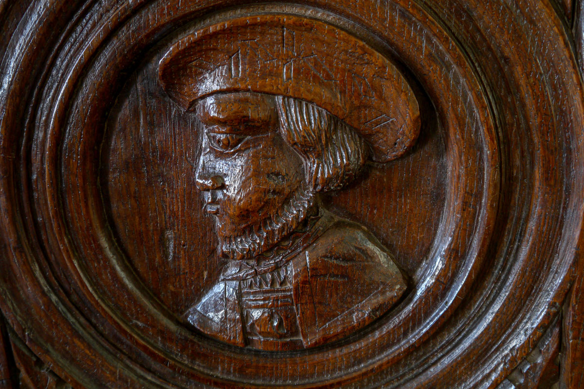 The finely carved head, wearing a cap or hat of Renaissance style, sitting above flowing hair, detailed face and full beard. Around the neck is a ruffed collar.