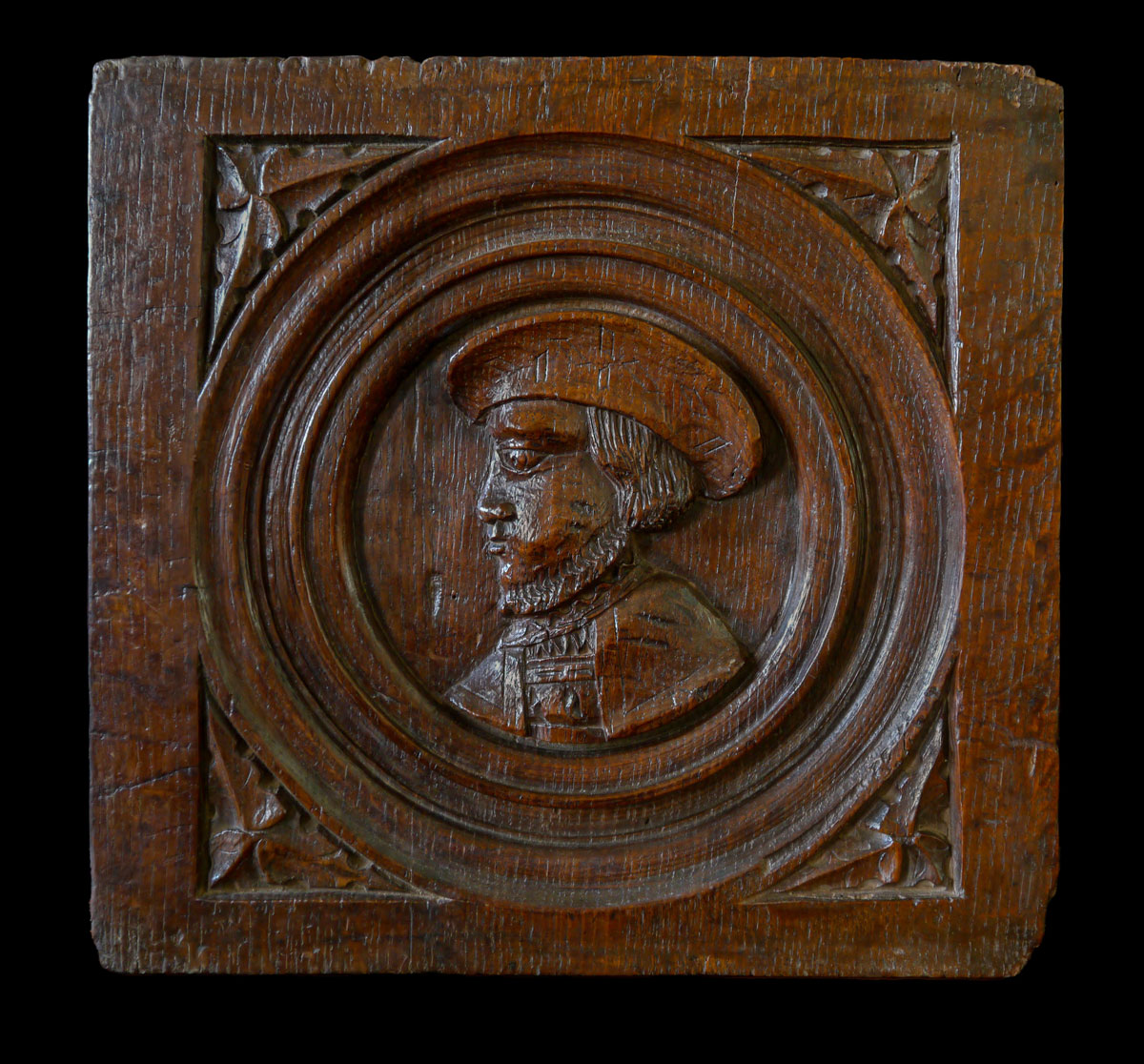 The head, facing to the figure’s right, is set within an exceptionally deeply carved roundel, finished in the corners with well-detailed oakleaf spandrels.