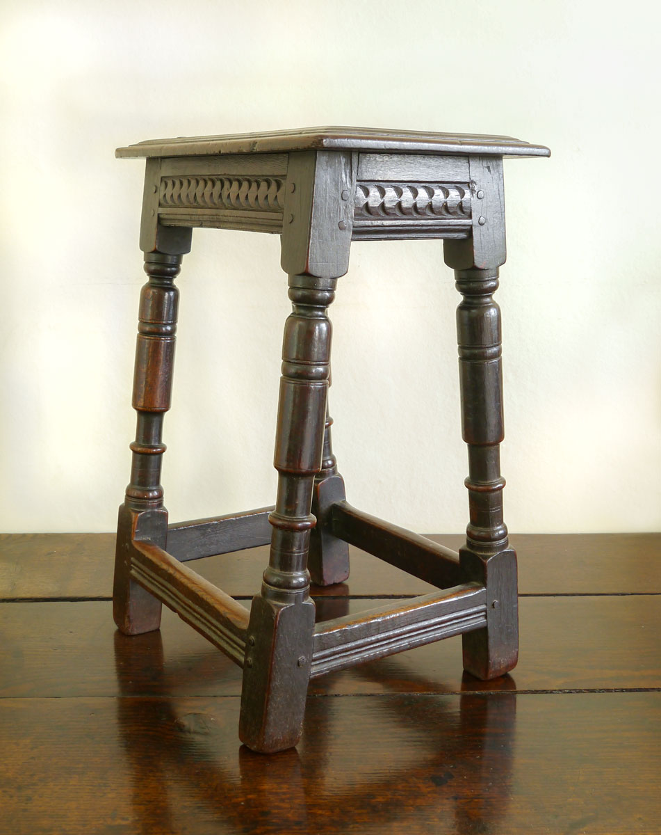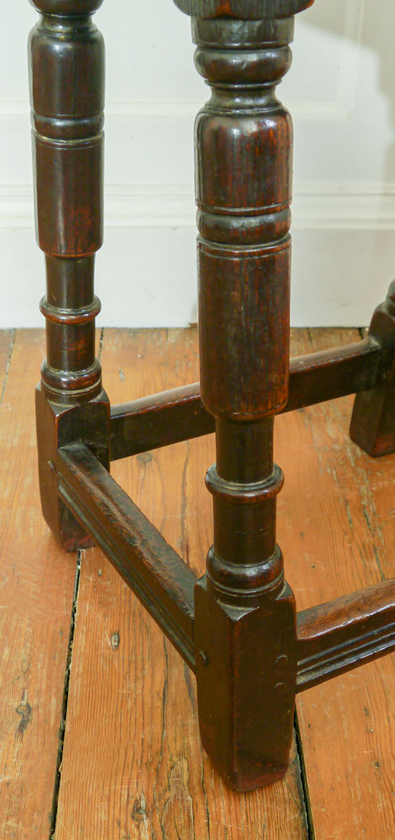 The triple-reeded boarded top, secured to the rails by six oak pegs. The rails themselves are carved with a “cable” type motif, often associated with the Salisbury area. The tall legs, beautifully turned, with a parallel baluster, the bottom of which finishes in a “reel”, slightly above the stretchers, which have a good run-moulded decoration – there is an excellent length of foot below the stretcher, giving height and tremendous presence to the stool.