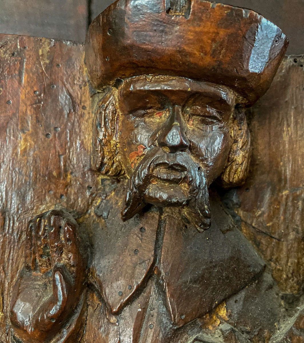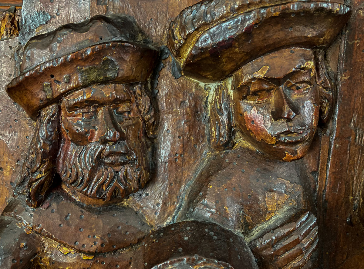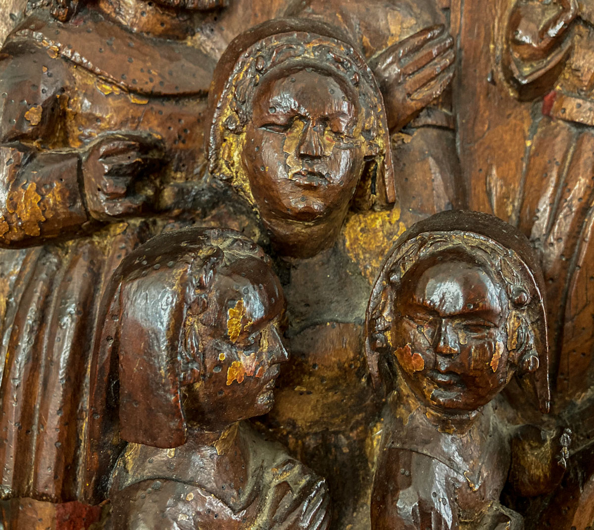 In this carving the four male figures are the priests and high priest (seated) of the temple. The lady looking forward is Anne – Mary’s mother – and of the two children, one is Mary, and the second Mary’s sister – Mary of Clopas (mother of James).