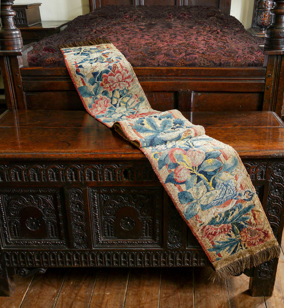 The ends of the border have been trimmed with a later metallic braid and fringe. The panel makes a superb table runner for a long table or dresser base.